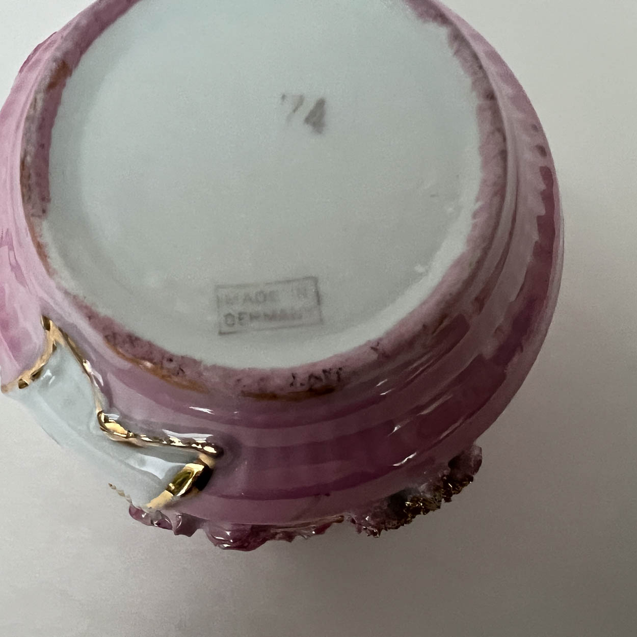 It measures 3" tall by 4-1/4" wide. Made in Germany with a stamp on the underside. It's in superb condition.