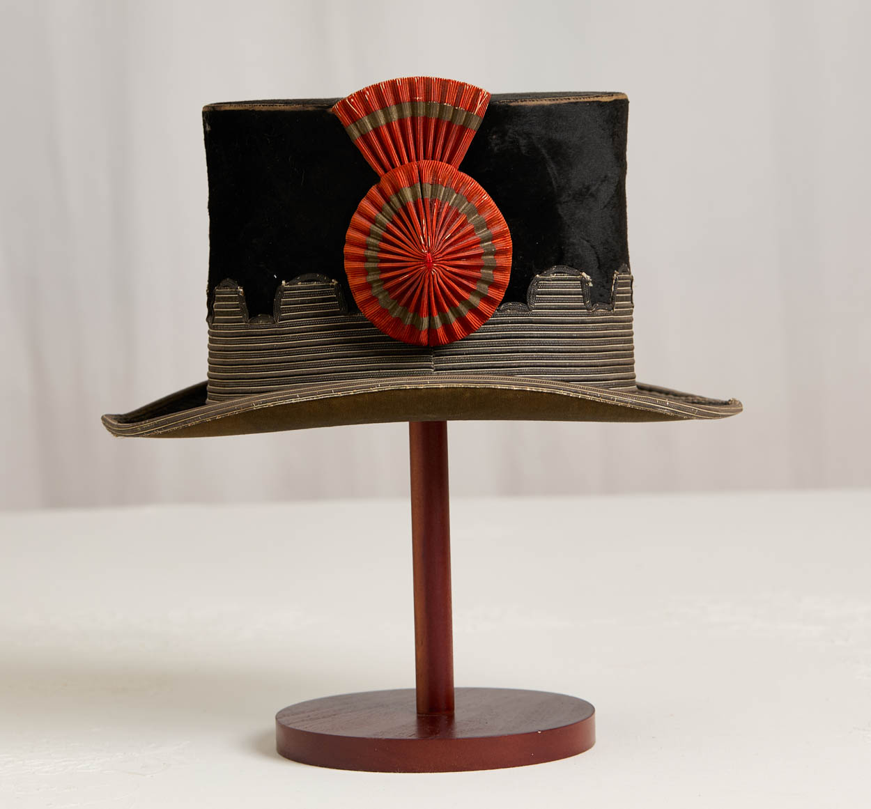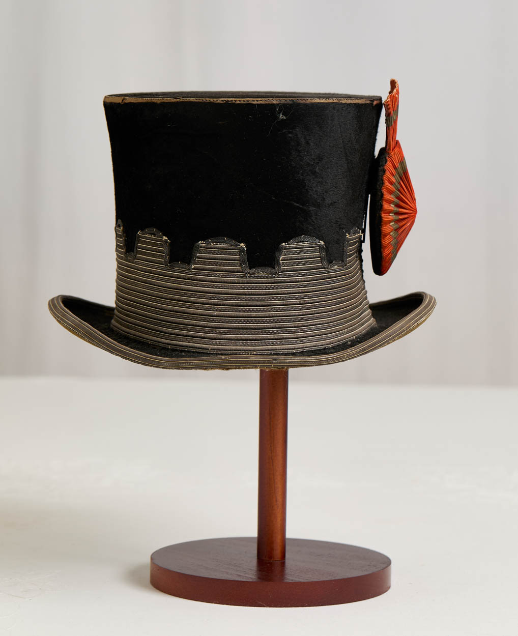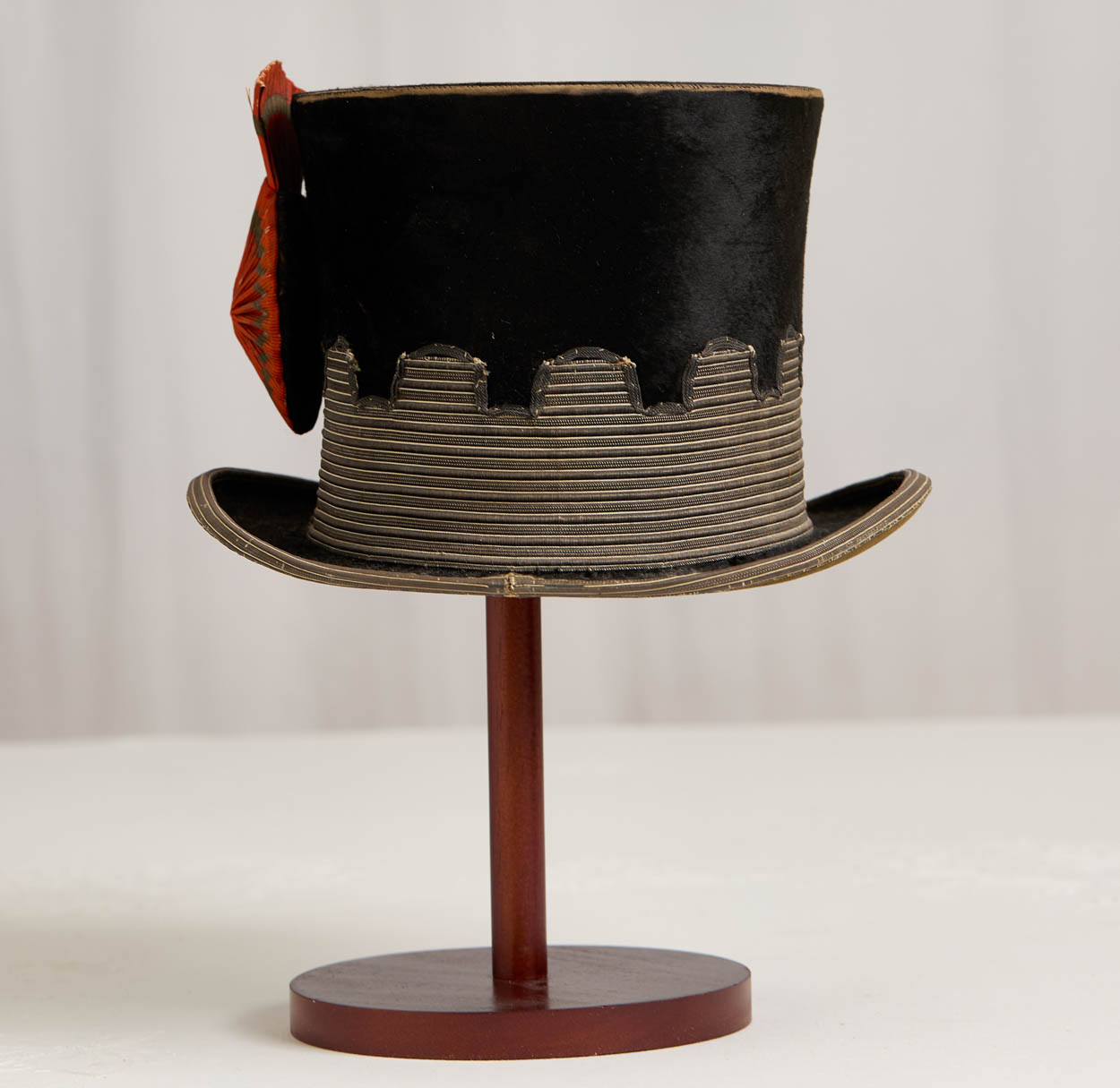 A rare Victorian era decorated beaver skin top hat dating to 1850-1870. This hat would have been worn by a marshall in a parade.