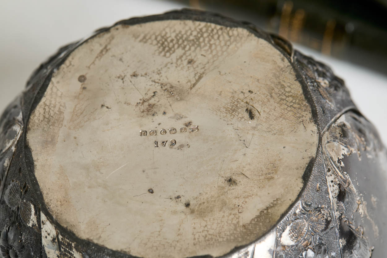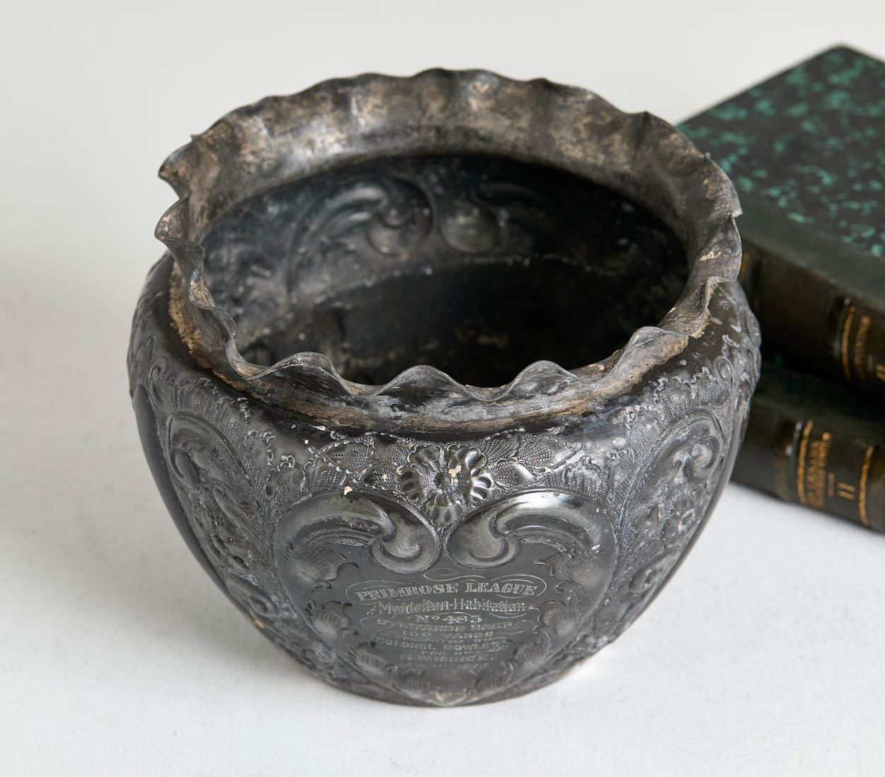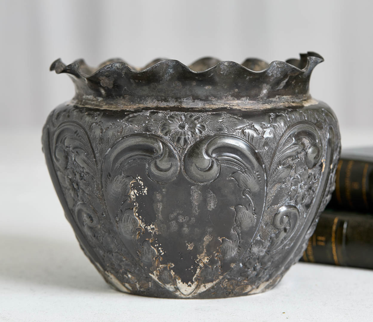 It has wonderful repousse and measures approx. 7-1/2" in diameter and 5" tall.