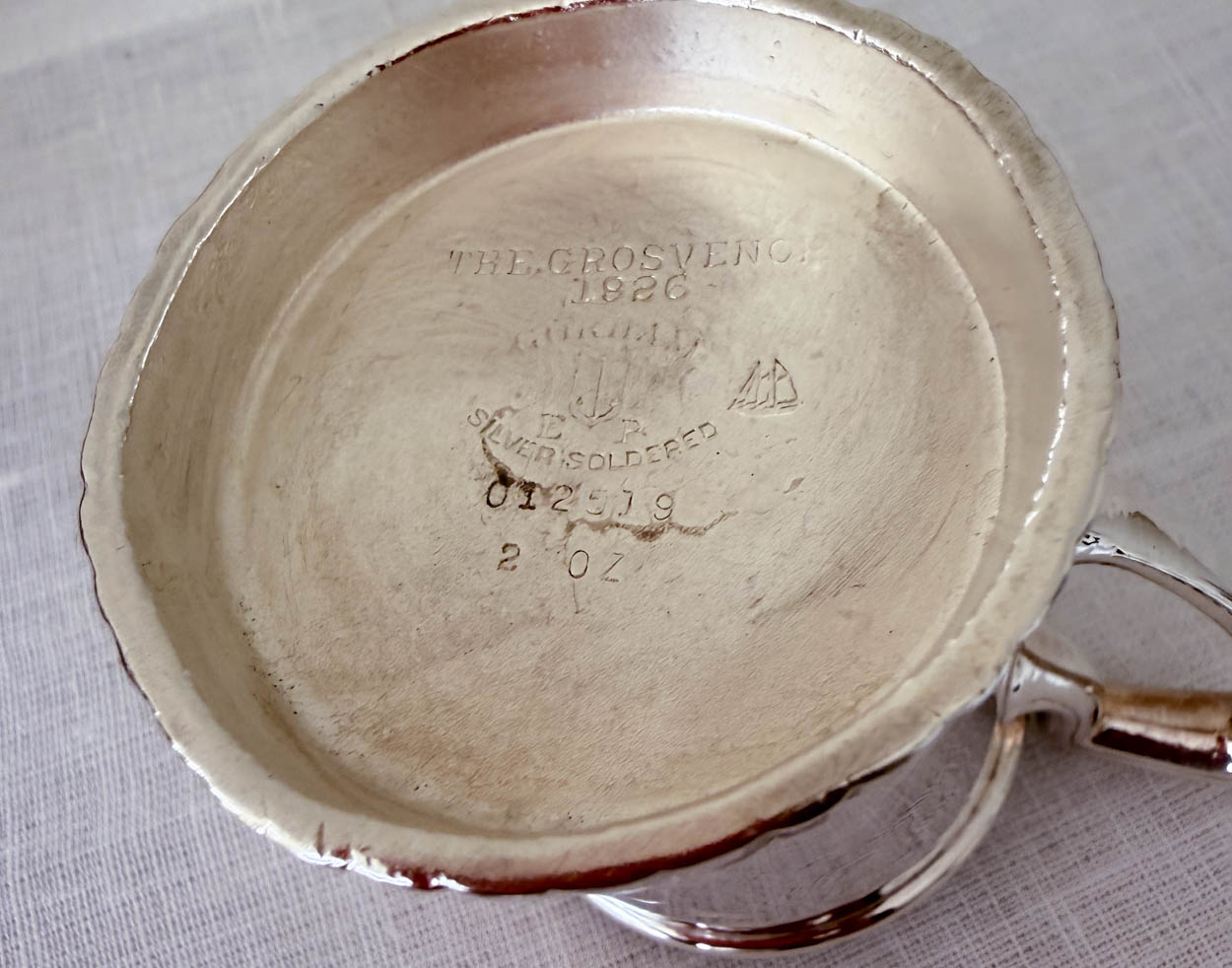 It measures 2-1/4" tall and 3-1/4" wide. Manufactured by Reed & Barton and stamped, "Hotel Grosvenor". Dated 1926.