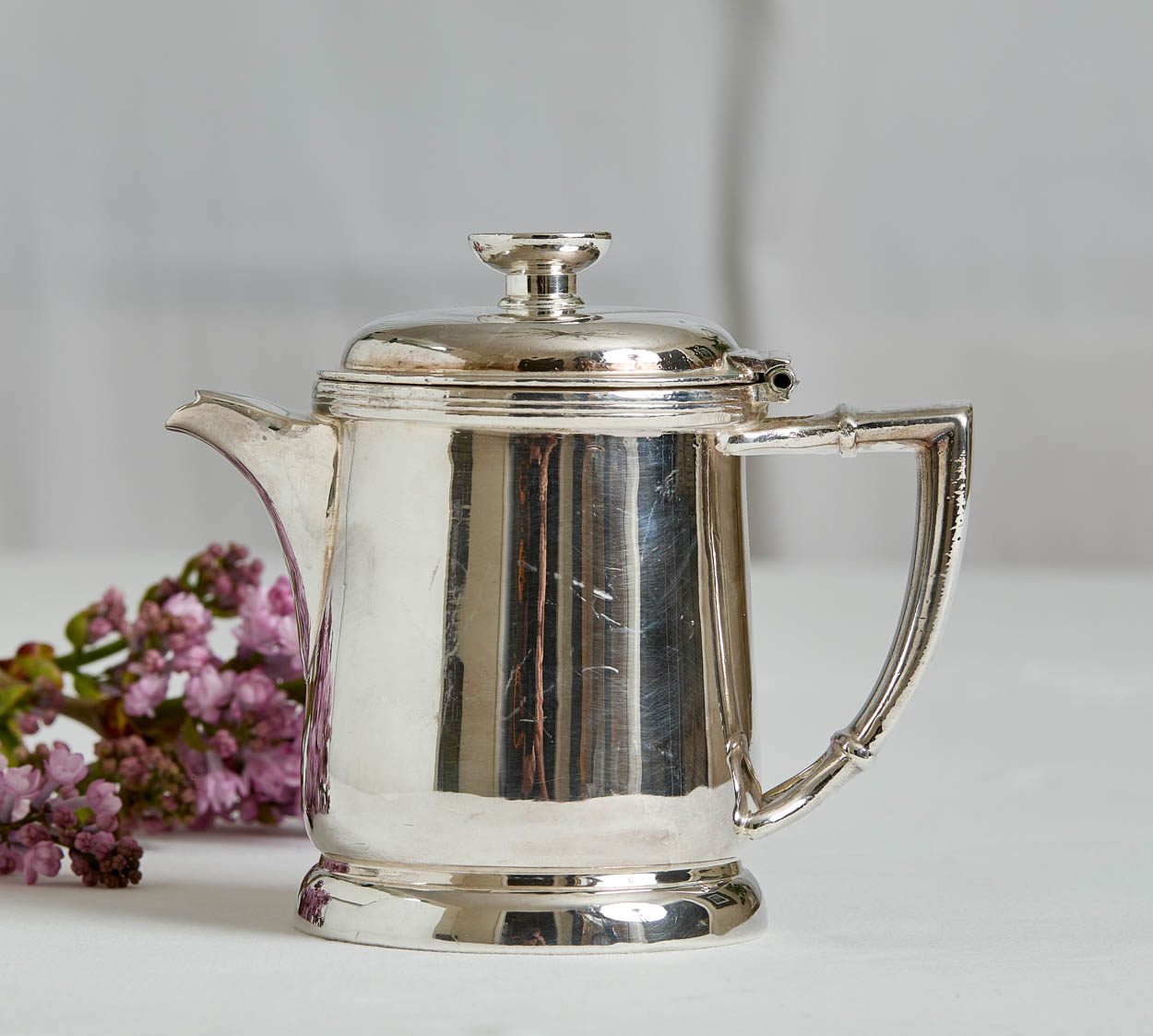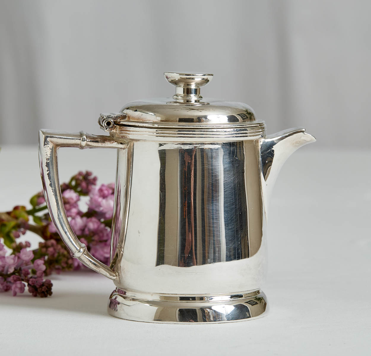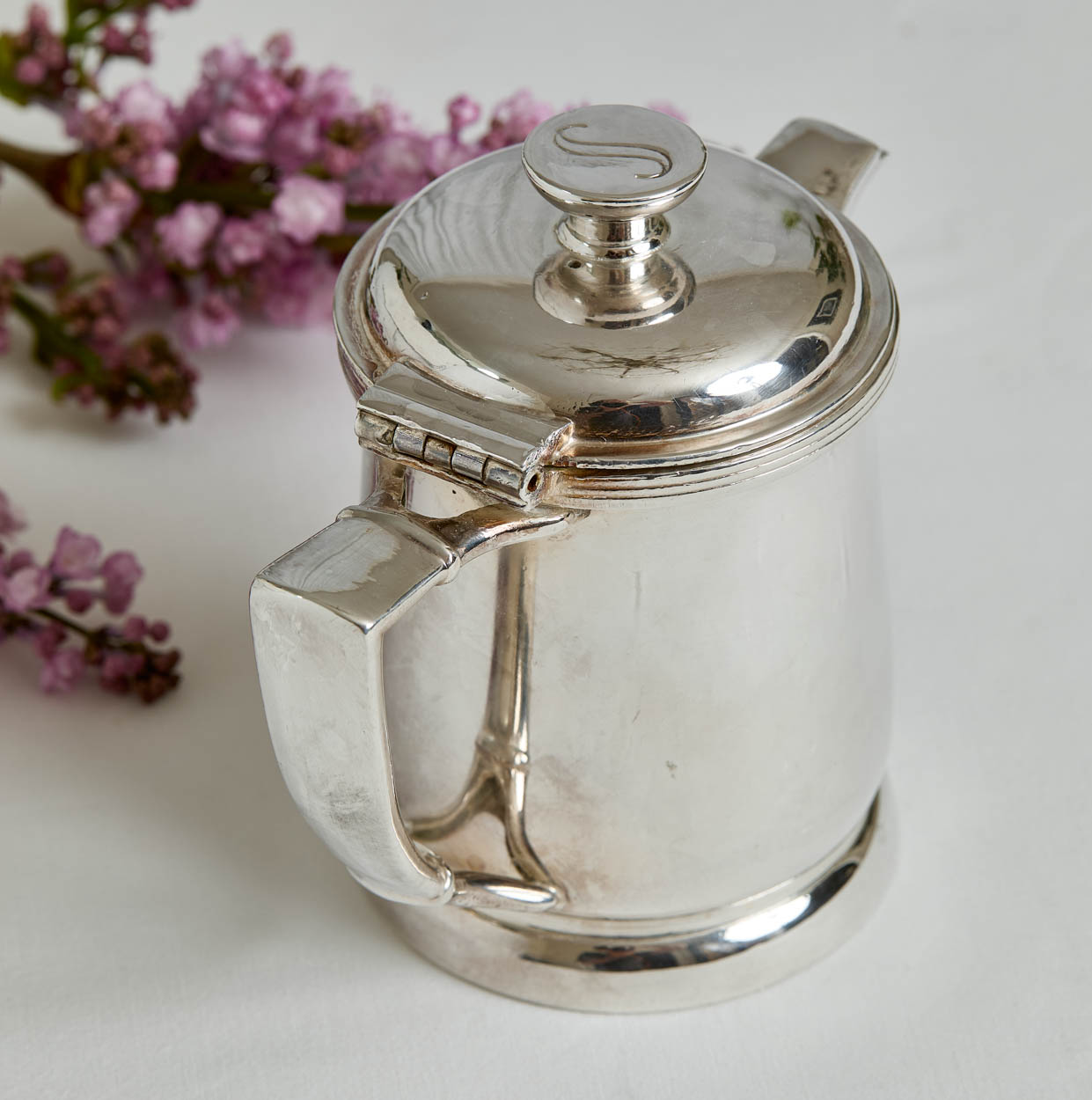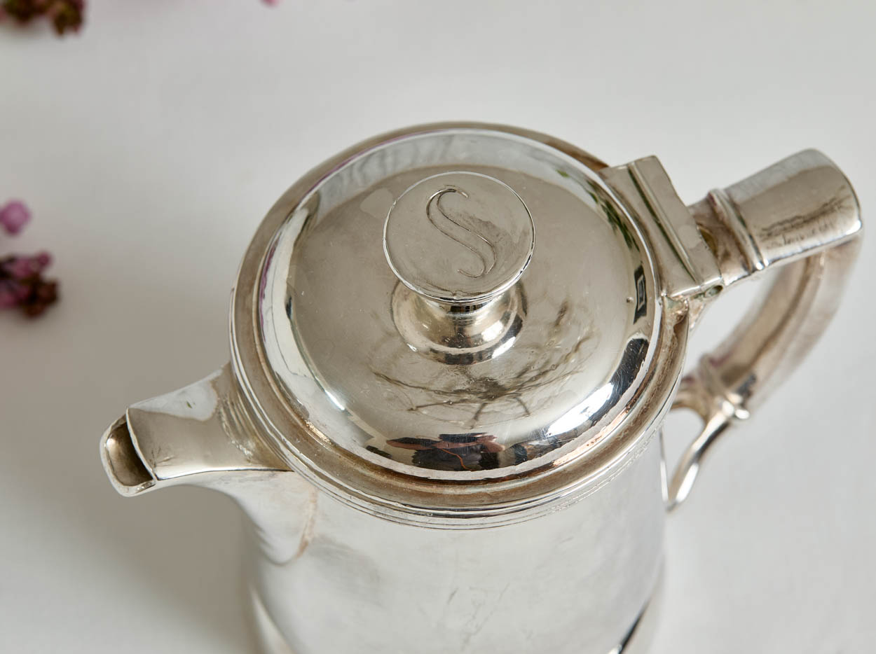 The teapot has the Statler's "S" logo on the finial. The teapot measures 5" tall and 5-1/2" from handle to spout. It has a mirror-like patina with some light scratches. The interior has been lined and is clean for serving.