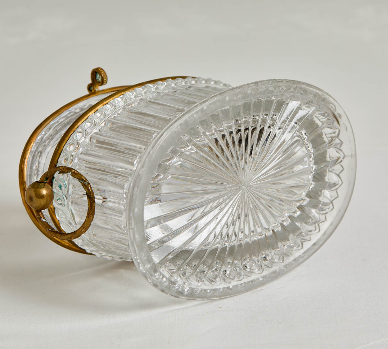 This amazing box has fine detail--from the round metal handles to the cut glass patterns.