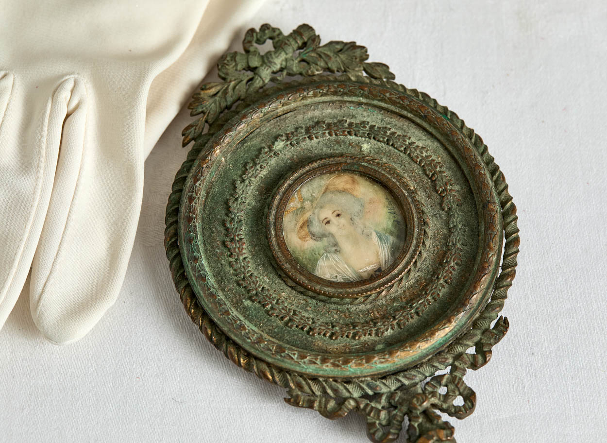 Acquired in France, a beautiful patinated cast metal hand mirror with a woman portrait in the center.