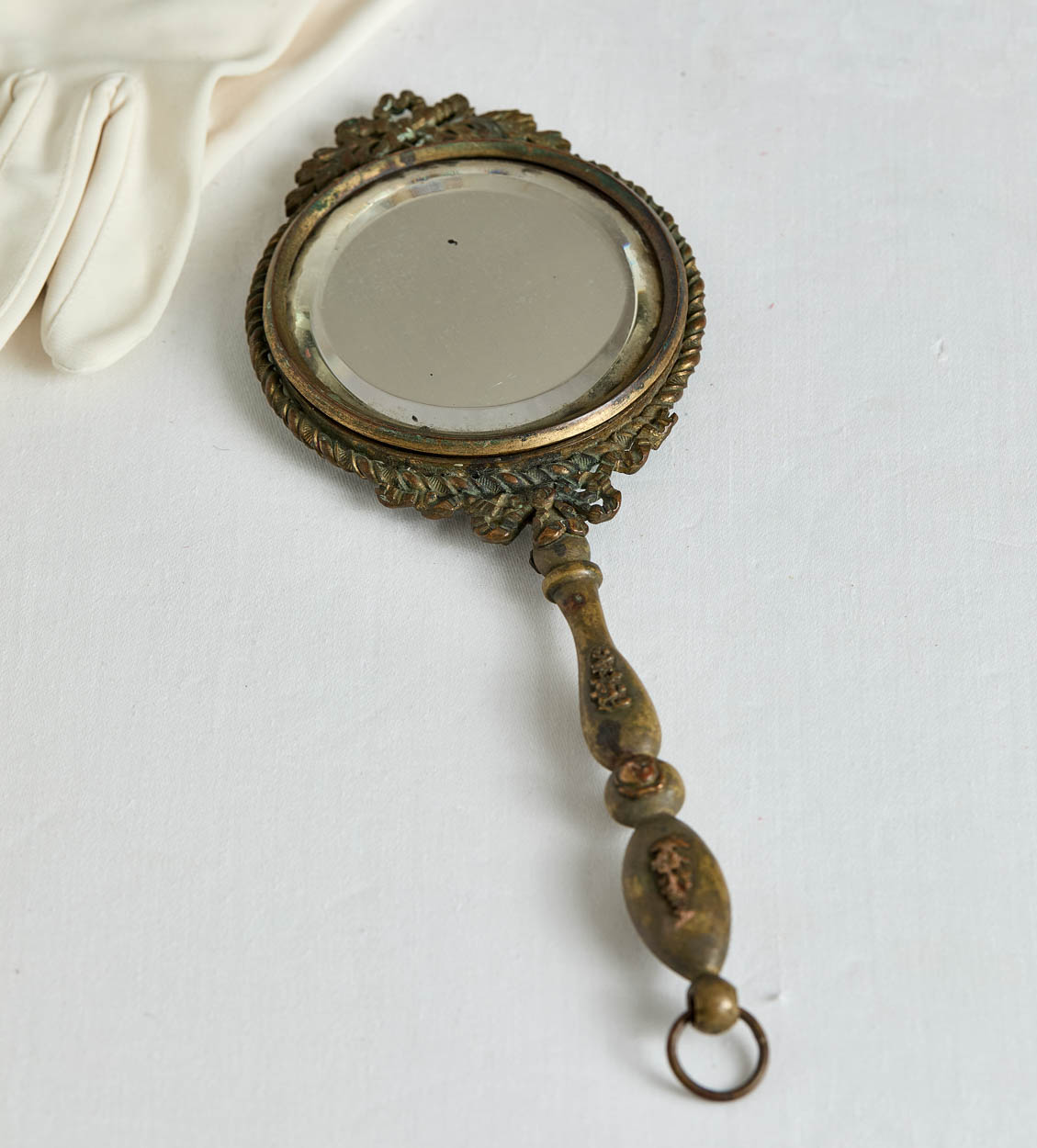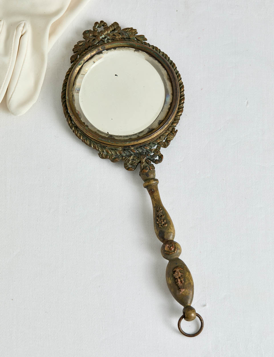 One side features ornate detail with some verdigris from age. This gives it a true French feel that we love. The back has the beveled mirror. This mirror has a hook, so it would be fun to hang!