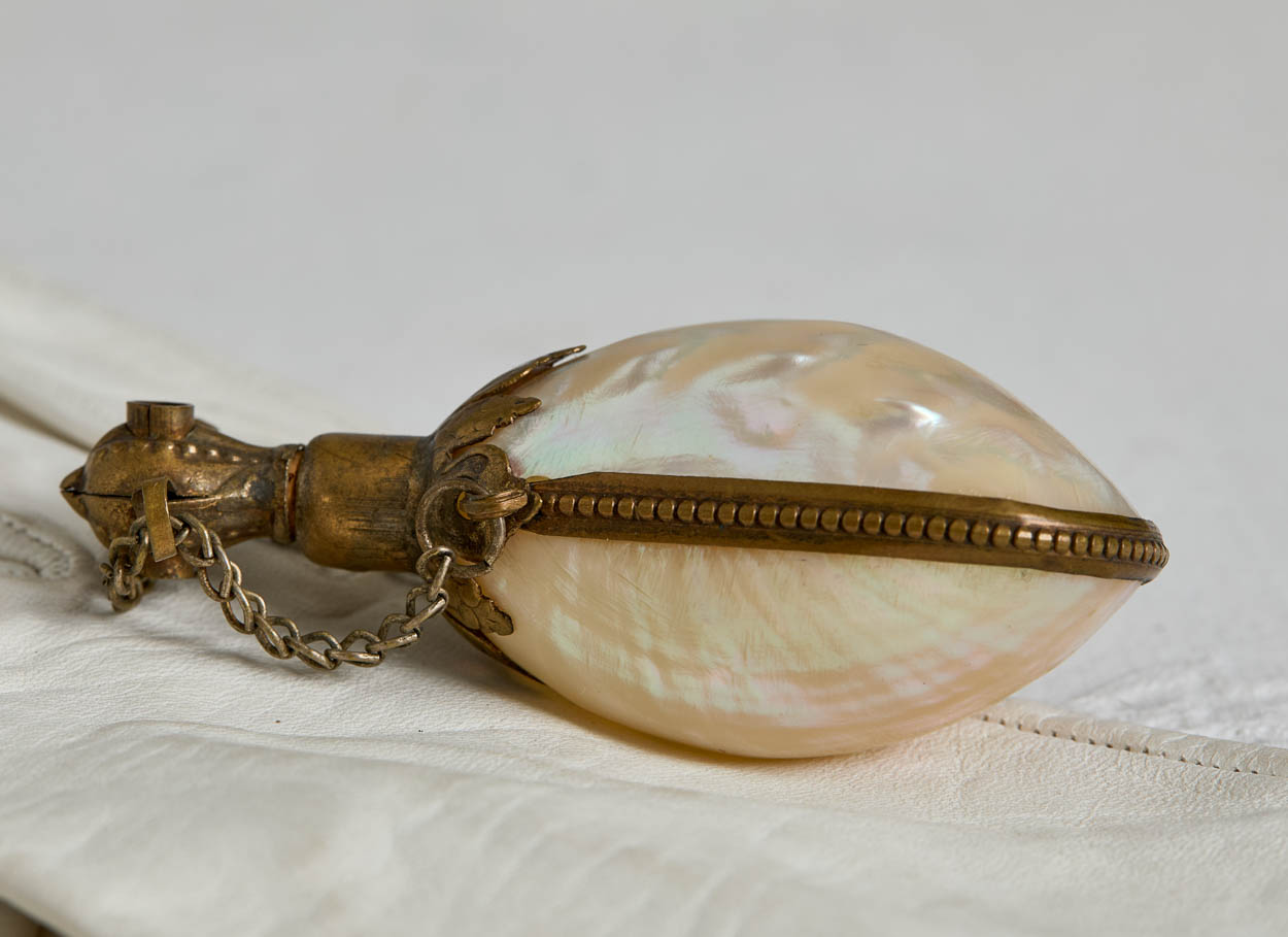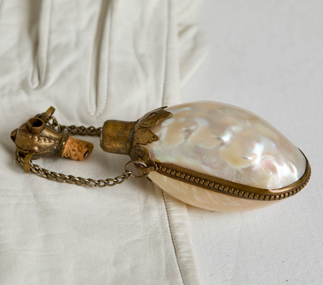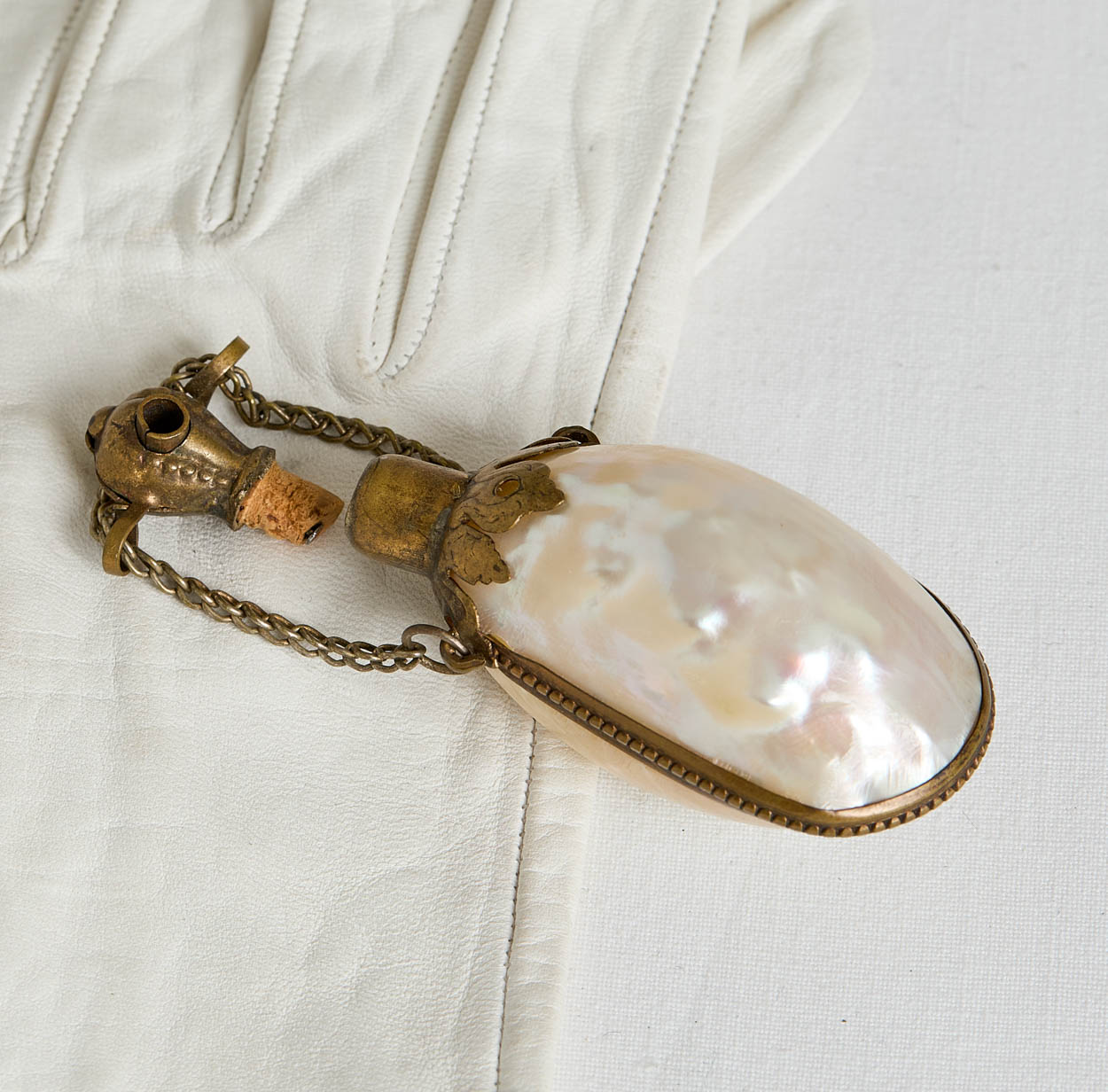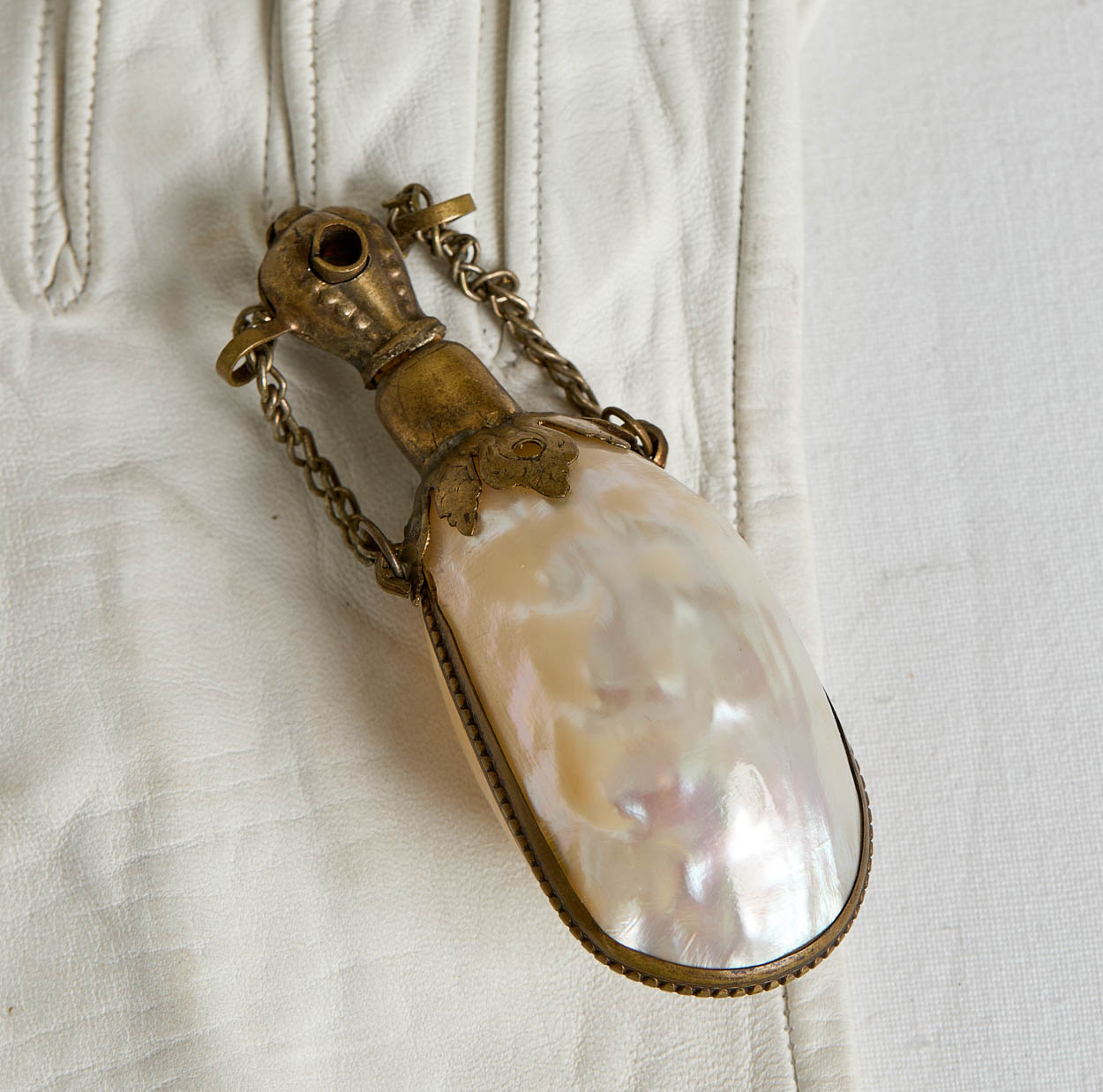 This scent bottle has the original stopper. The piece measures 2-3/4" long. It's in excellent condition.