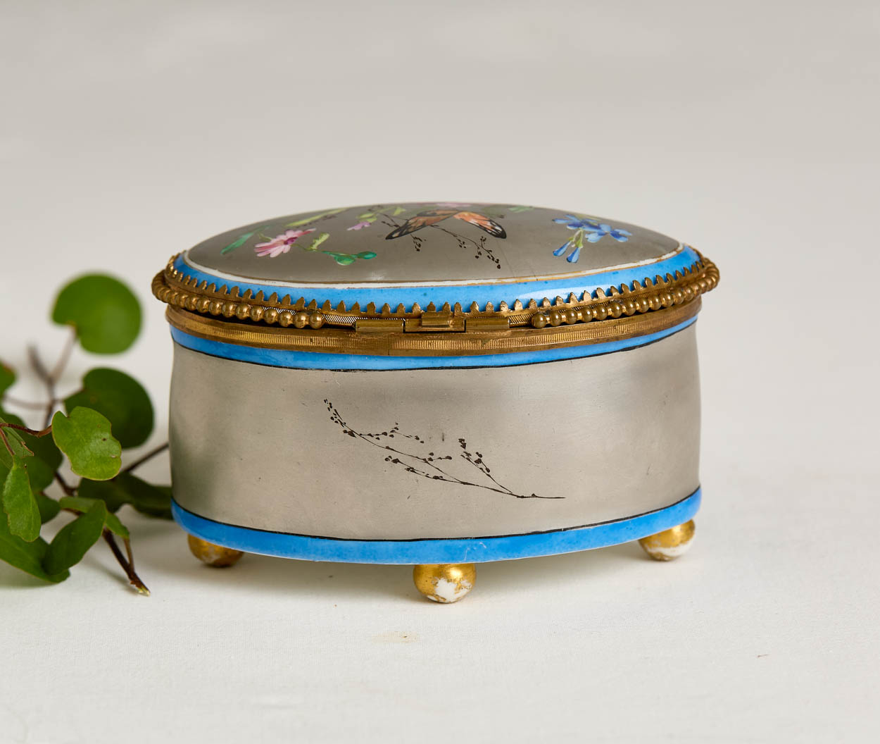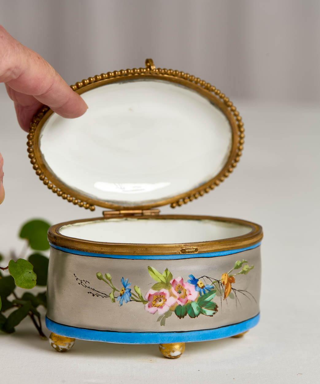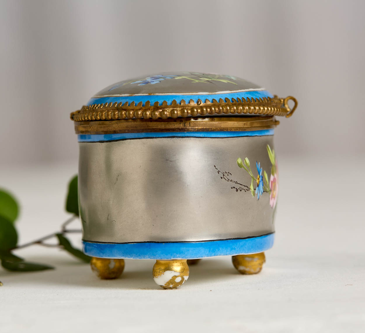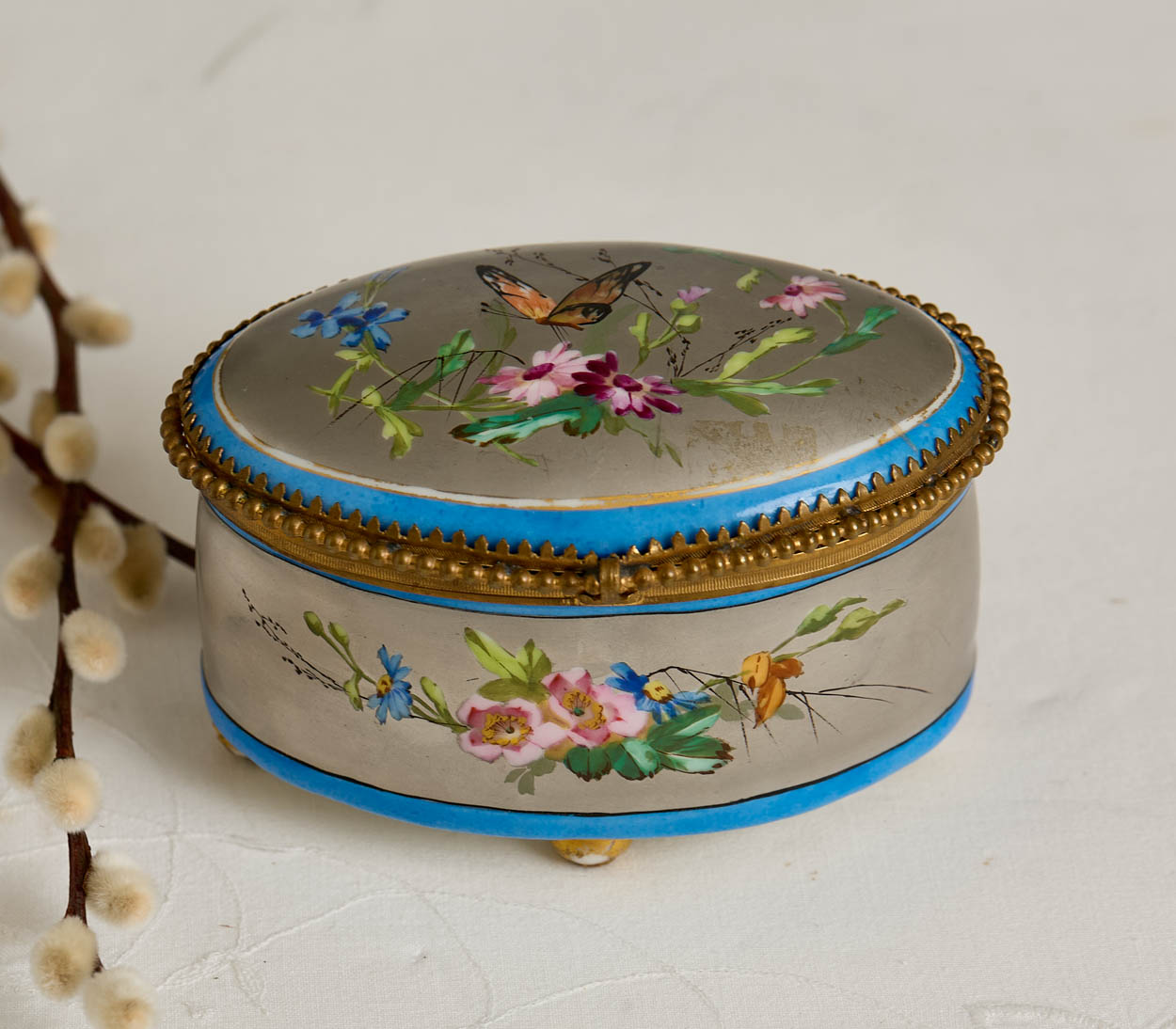 Acquired in France, a gorgeous silvered footed porcelain trinket box with hand painted flowers and a butterfly on the lid and a floral motif on the side.