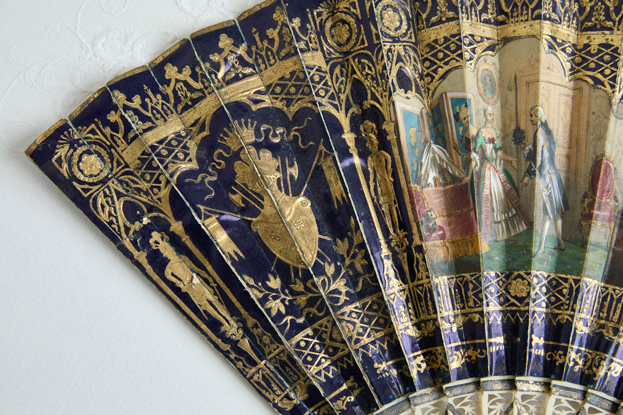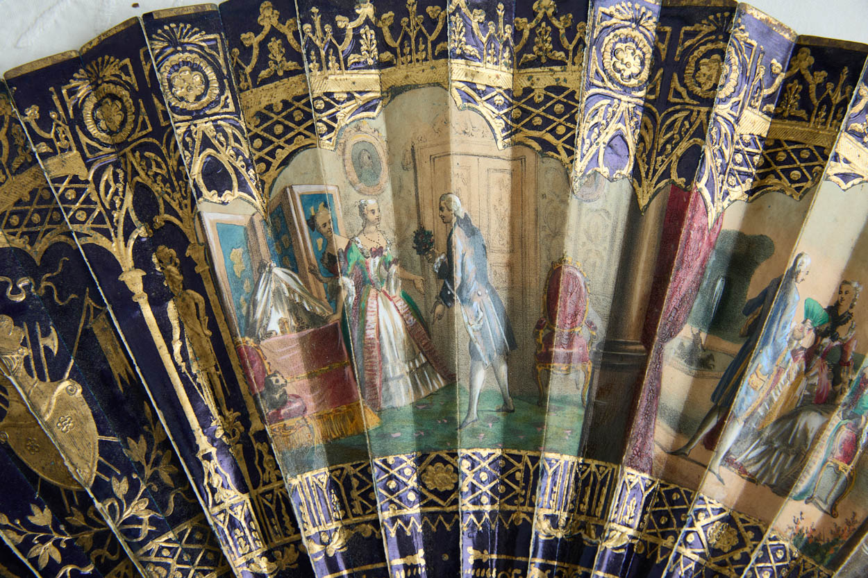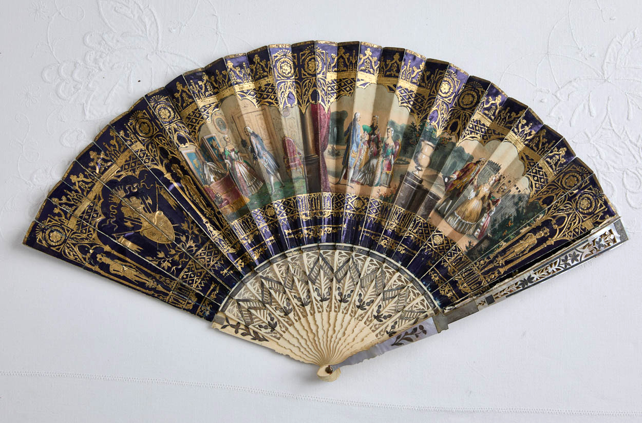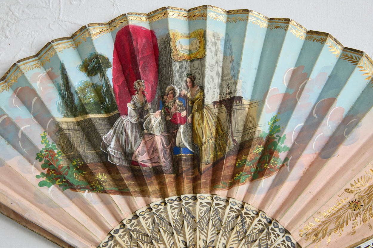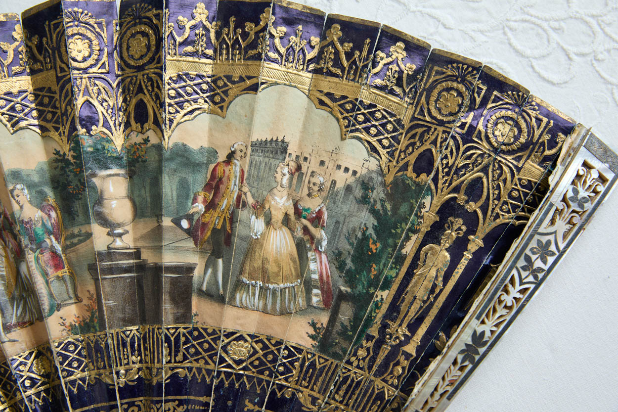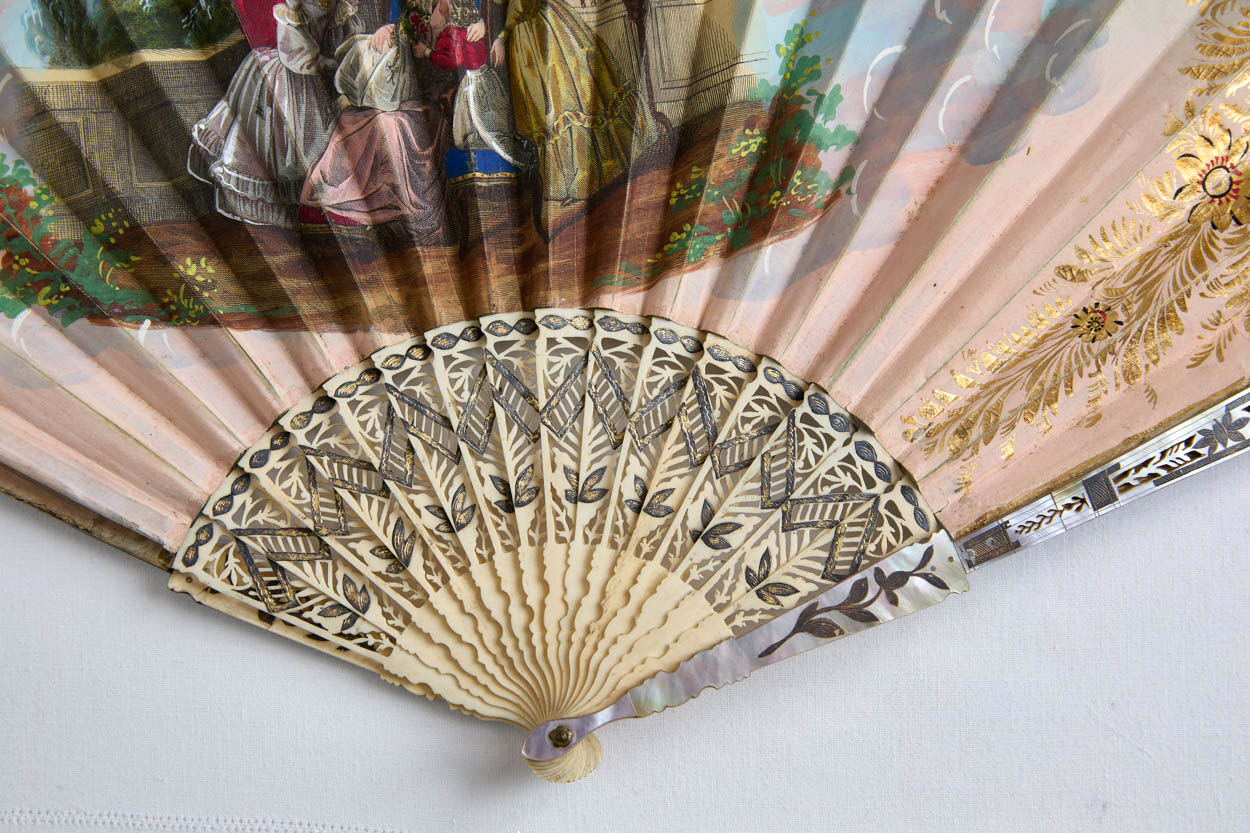 The fan is scenic on both sides are lithographed with hand painting. The fan is made of carved ivory, sterling inlay and inlaid mother of pearl. There are gilt accents throughout. It doesn't get better than this.