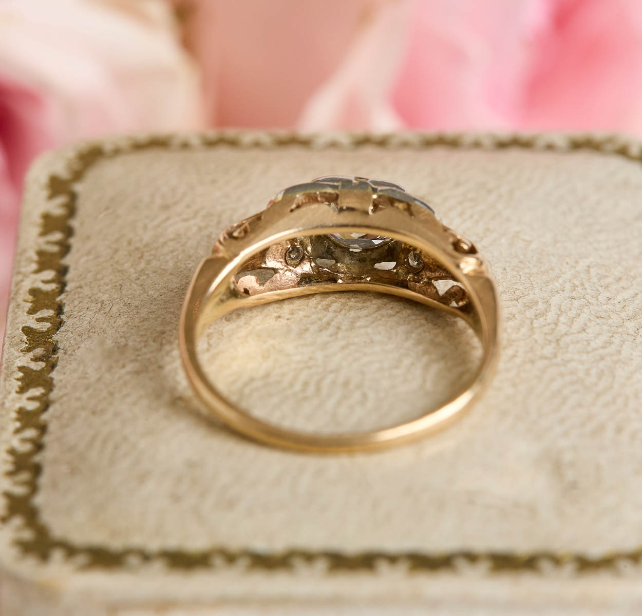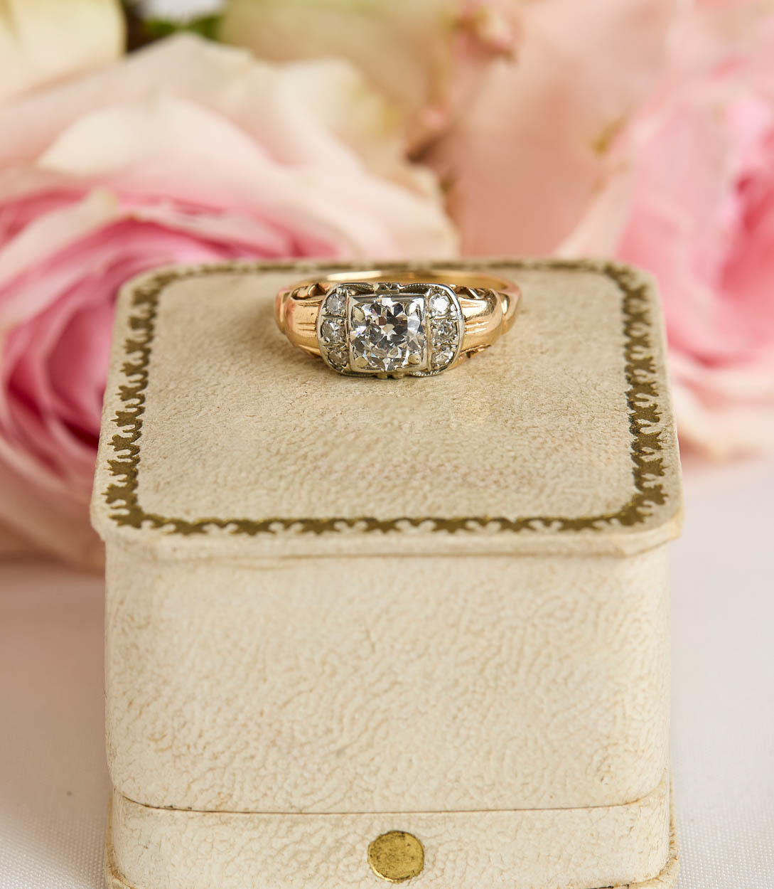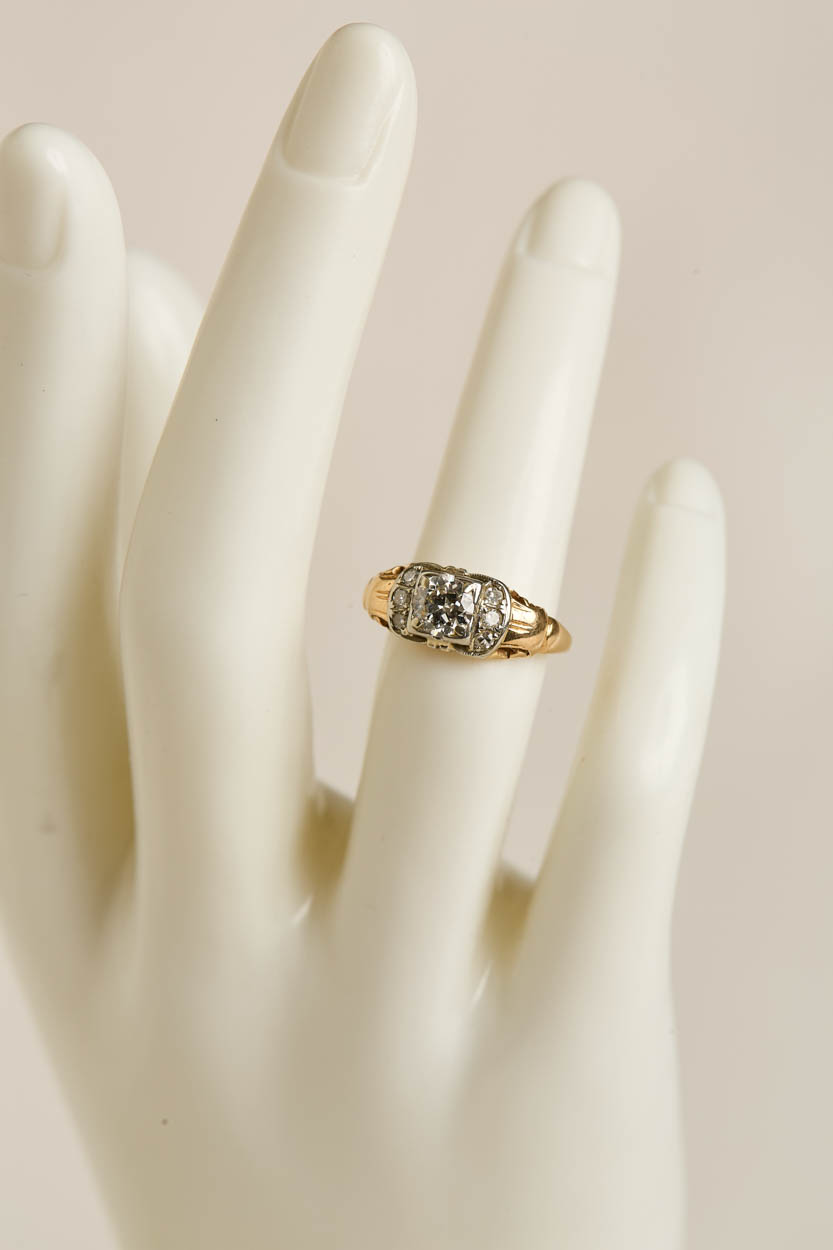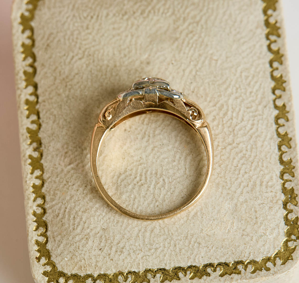 The ring is 14K yellow and white gold and houses a 40 point diamond surrounded by 6 small diamonds. Ring is a US size 5 and is sizeable. Total weight is 2.2 grams.