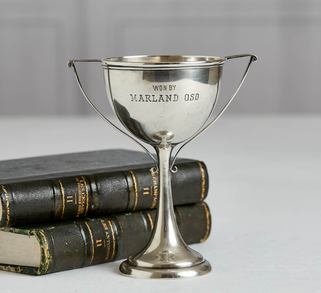 The trophy is engraved, "CARRO-BETH KENNELS TROPHY FOR SMALLEST POM. DOG P.C.T.D.A. 1912". The backr reads, "Won by Marland Oso".