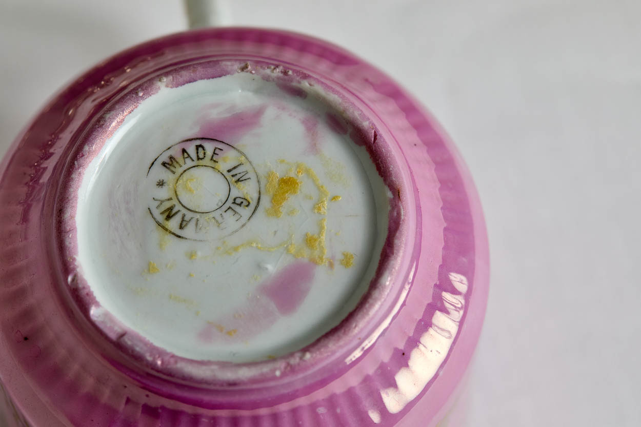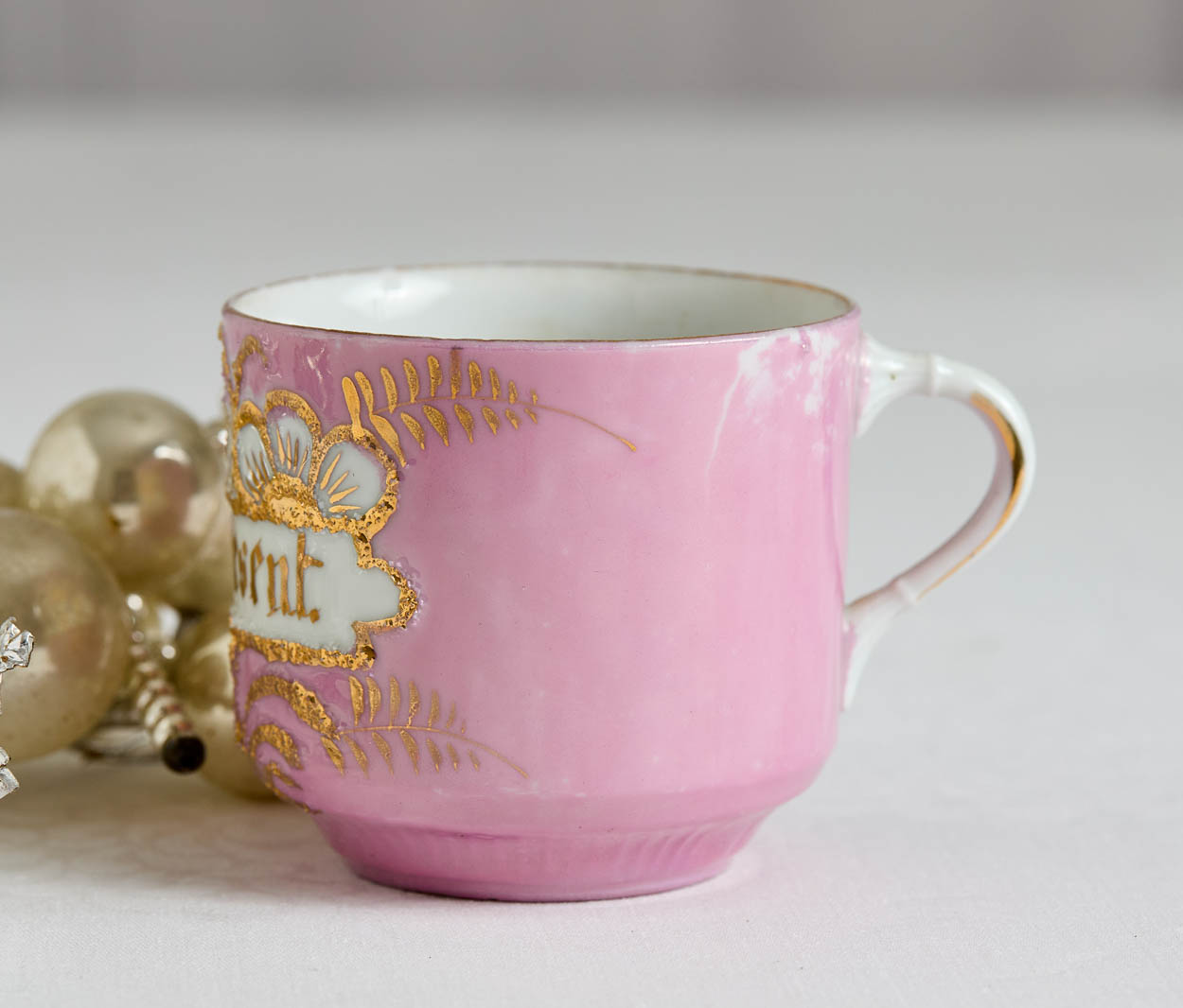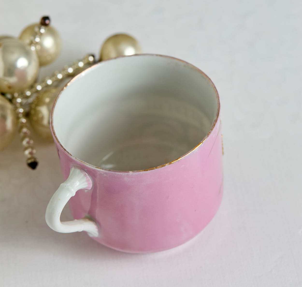 The mug has all of the bells and whistles. It has a floral motif with gilt high relief, meaning it is raised off of the mug. The gold, pink and white is so lovely in person.