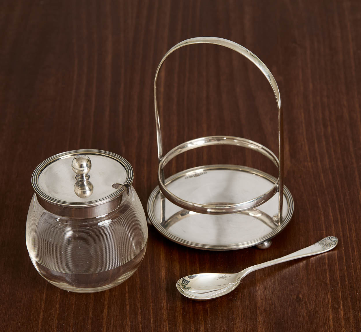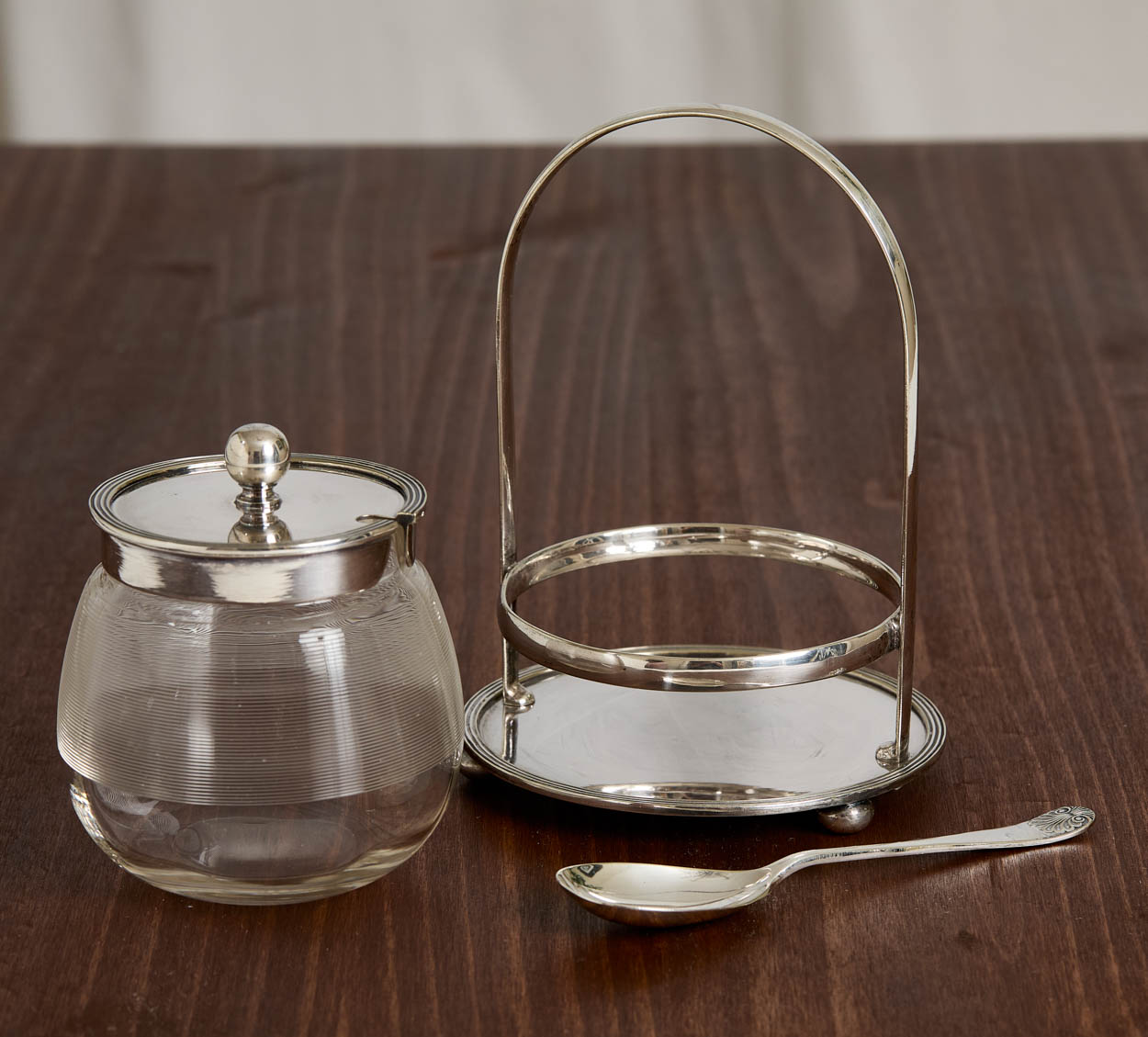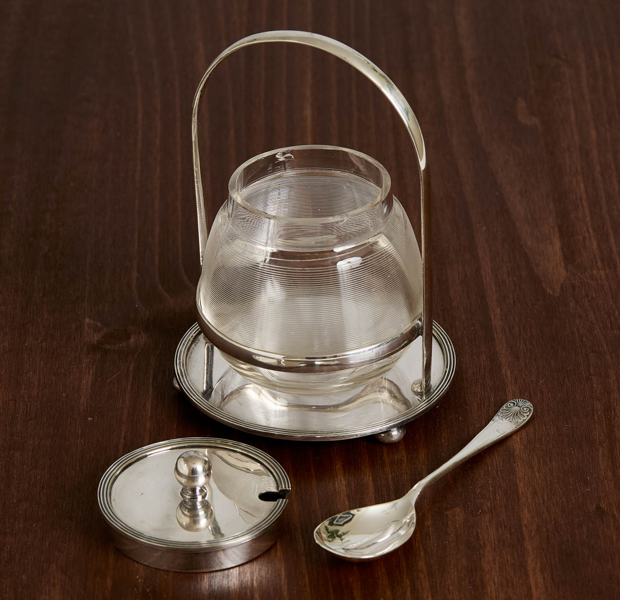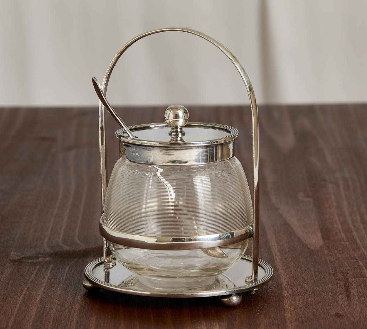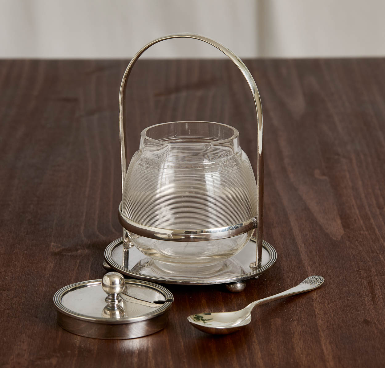 From England, a beautiful antique silver plate and glass jam or honey jar.