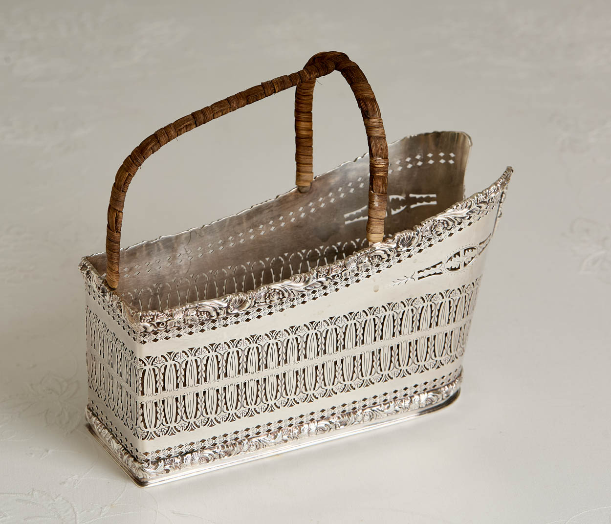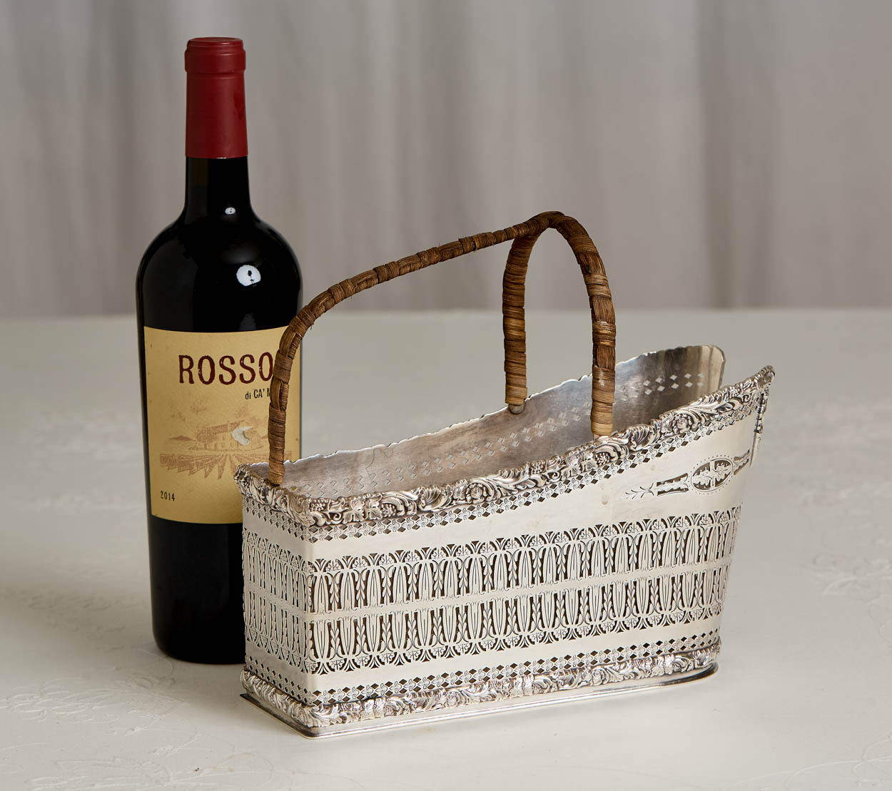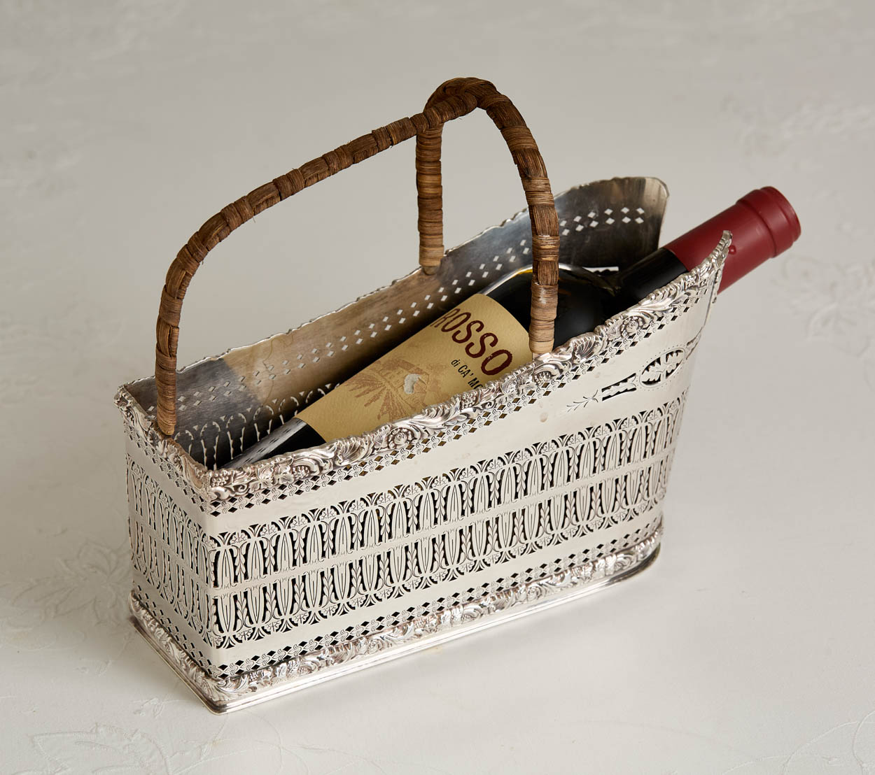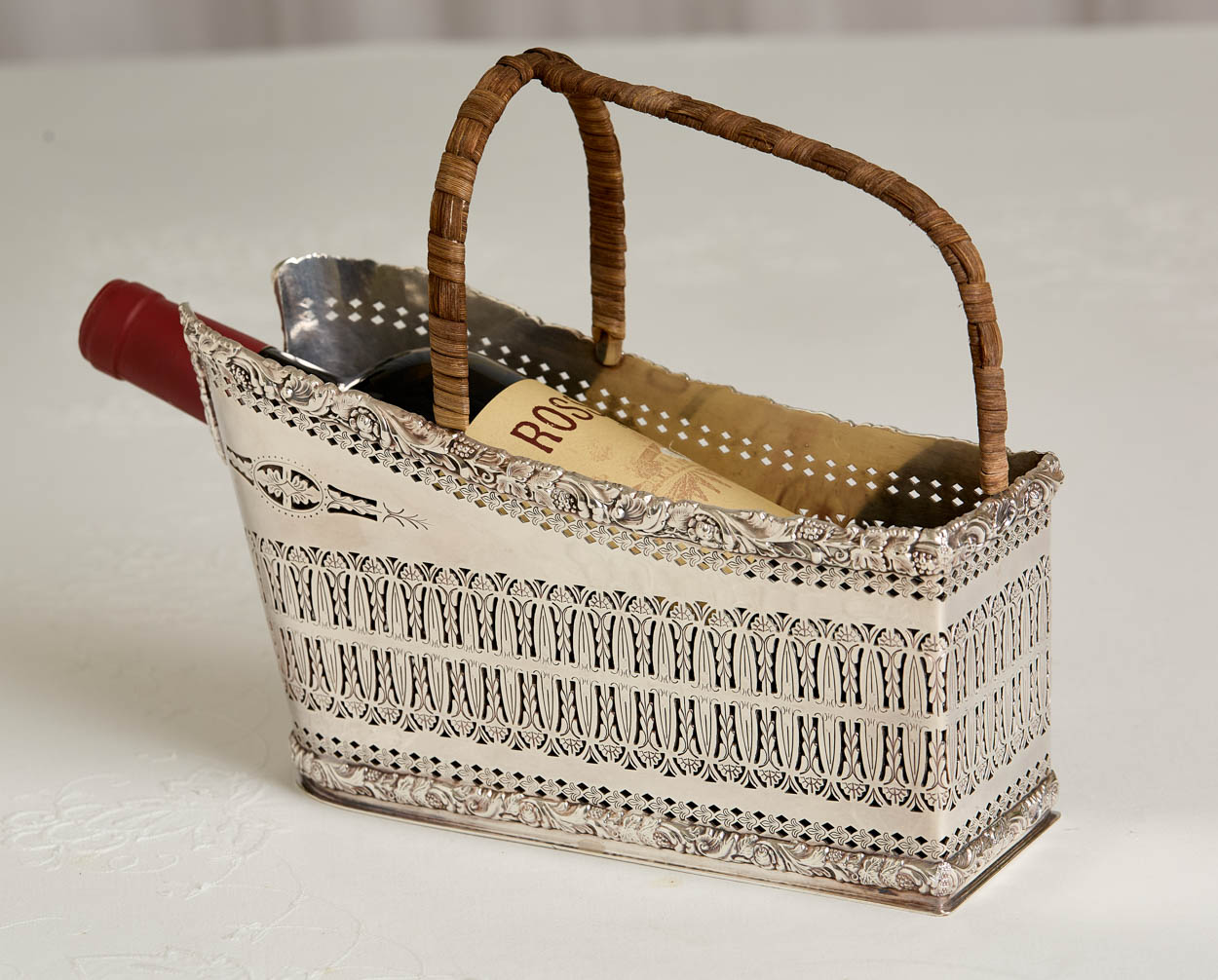A simply gorgeous antique English woven silver plate wine caddy with a rattan handle.
