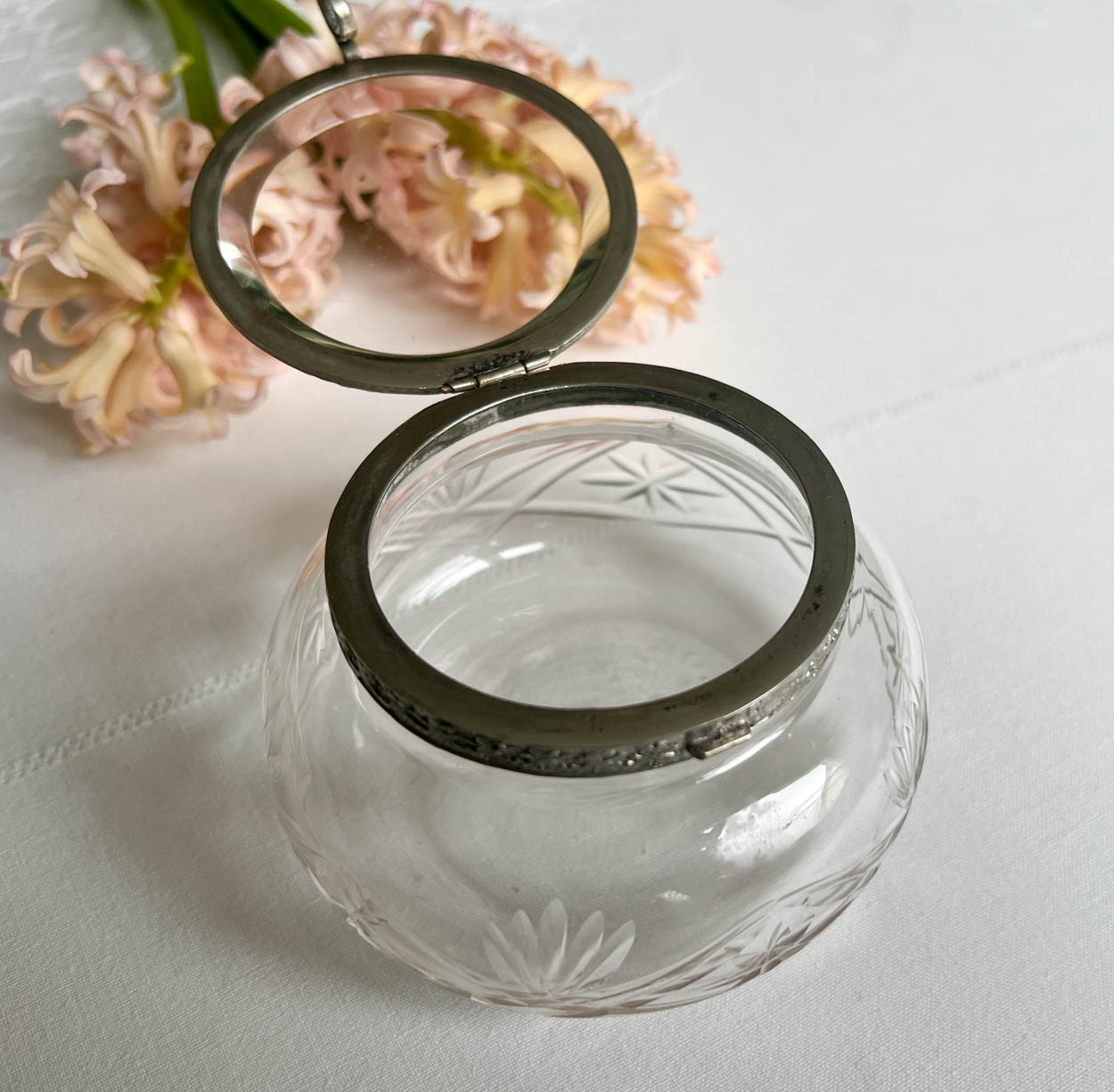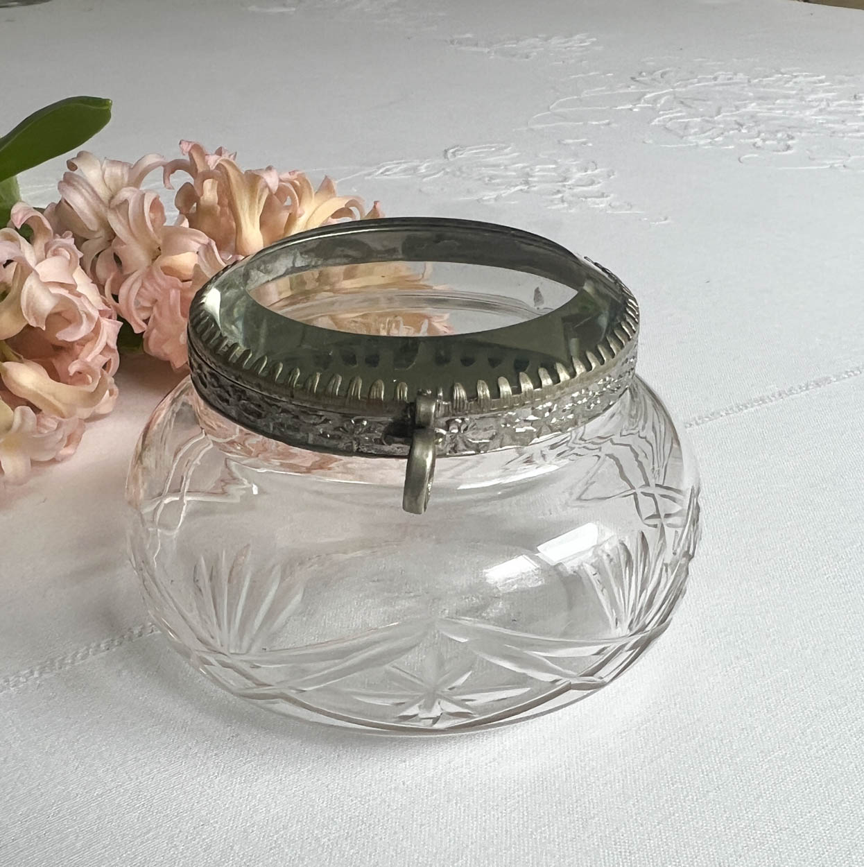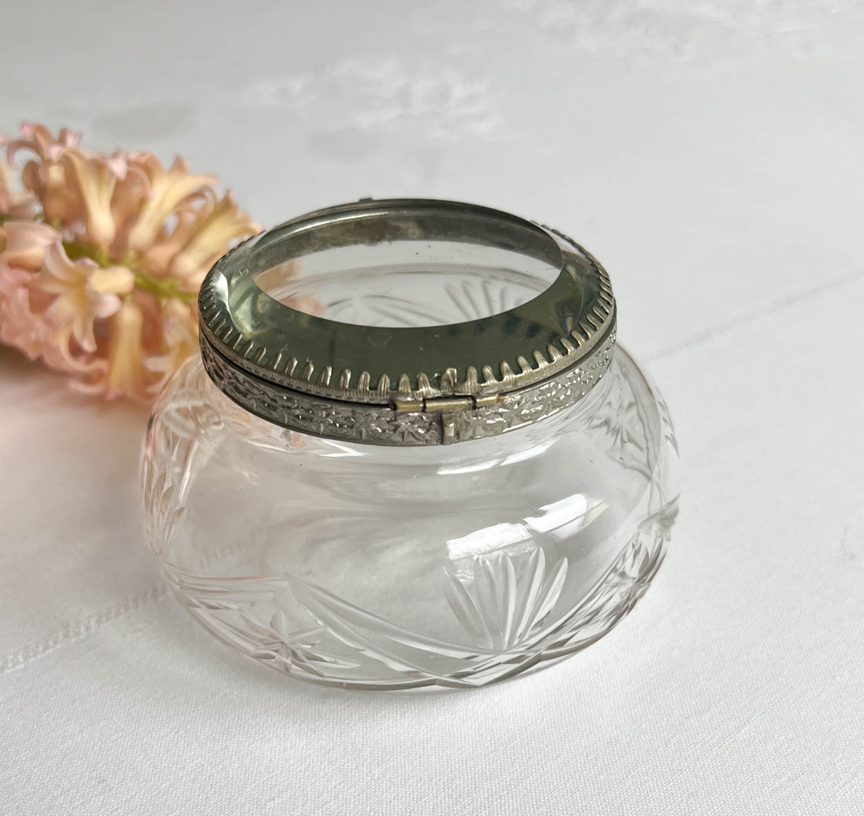 Acquired from an old estate, a lovely beveled glass top crystal powder jar. This may be French in origin.