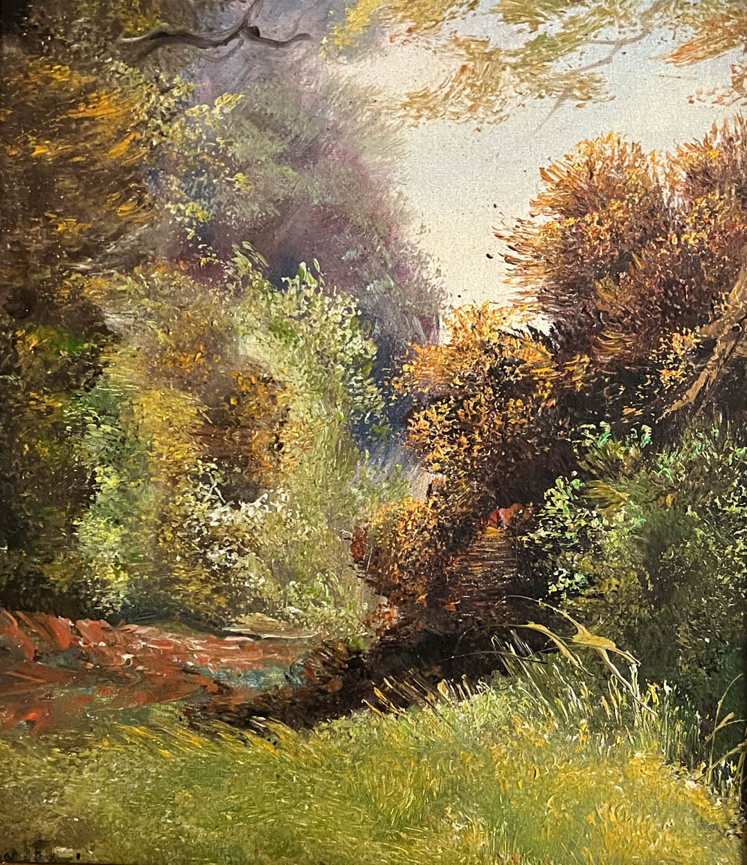Acquired in France, a gorgeous small landscape oil painting in a thick gesso frame.