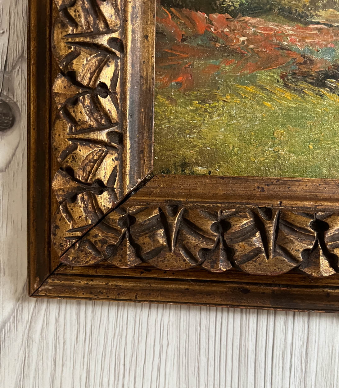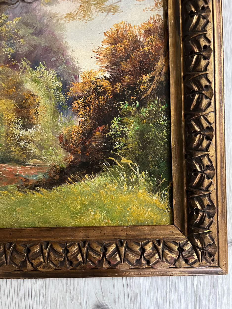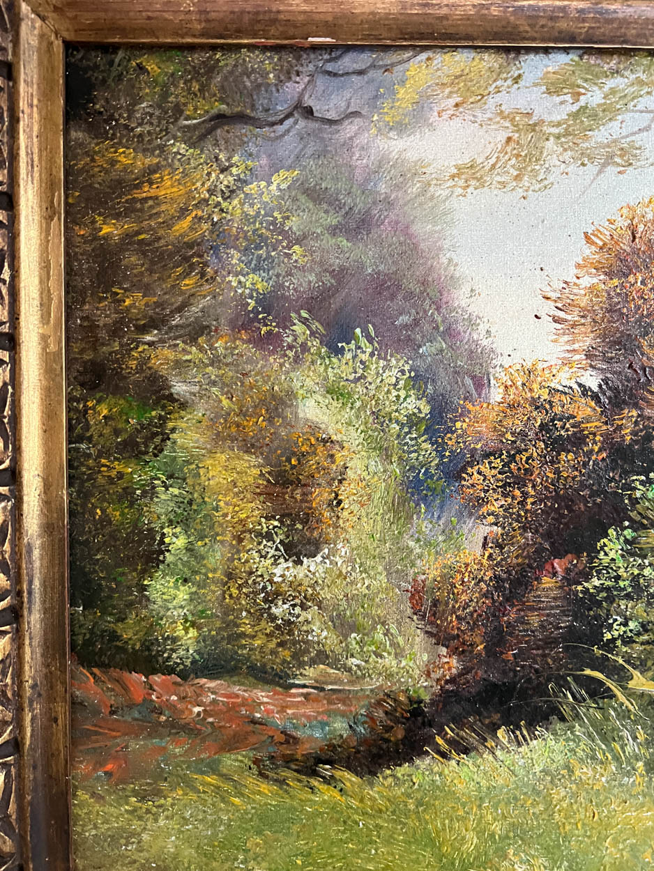 Antique French Landscape Oil in Gesso Frame