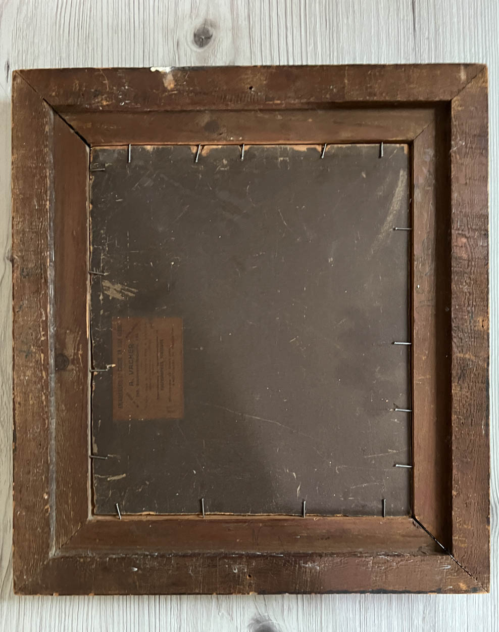The carved gilt gesso frame measures 17-1/2" by 15-3/4", and is 1-3/4" thick. Excellent condition. Faint signature by the artist in the lower left hand corner.