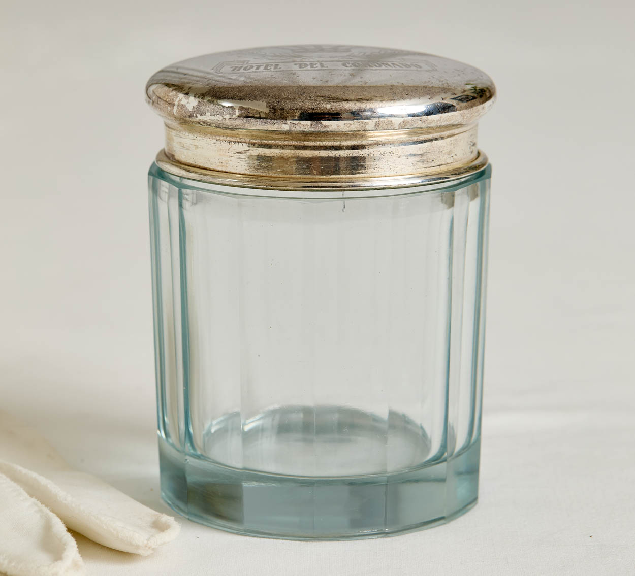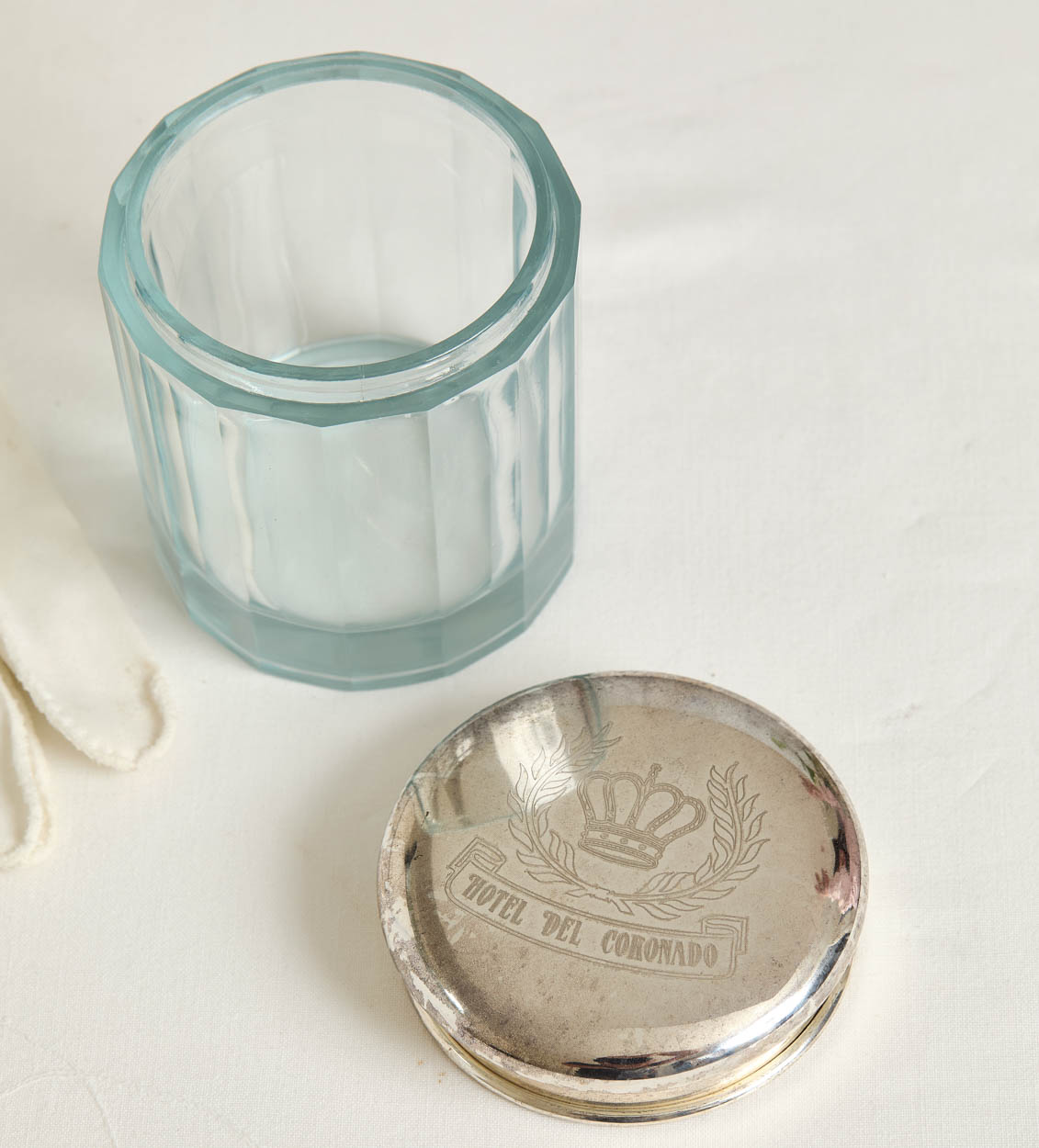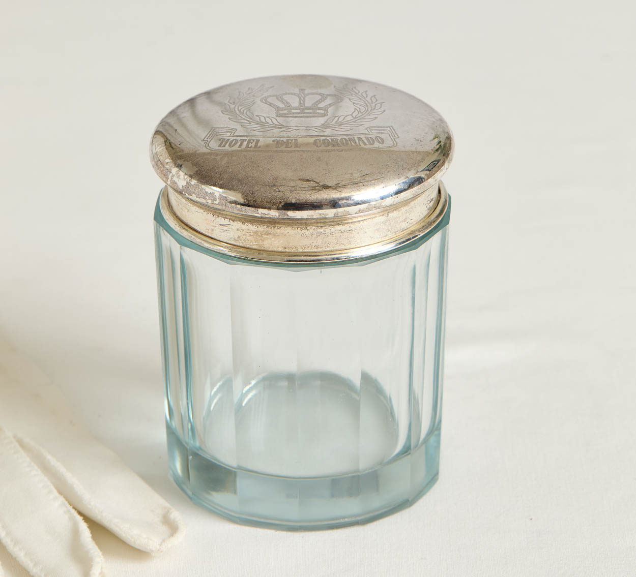 The jar is pale blue glass with a silver plated lid. The lid bears the hotel's name and crown crest. It has a bit of silver wear.