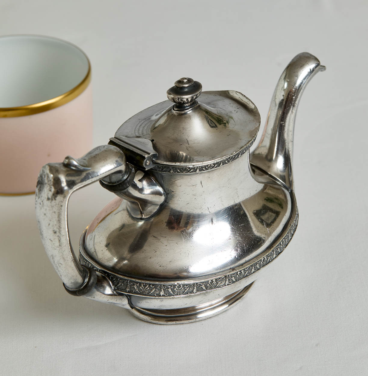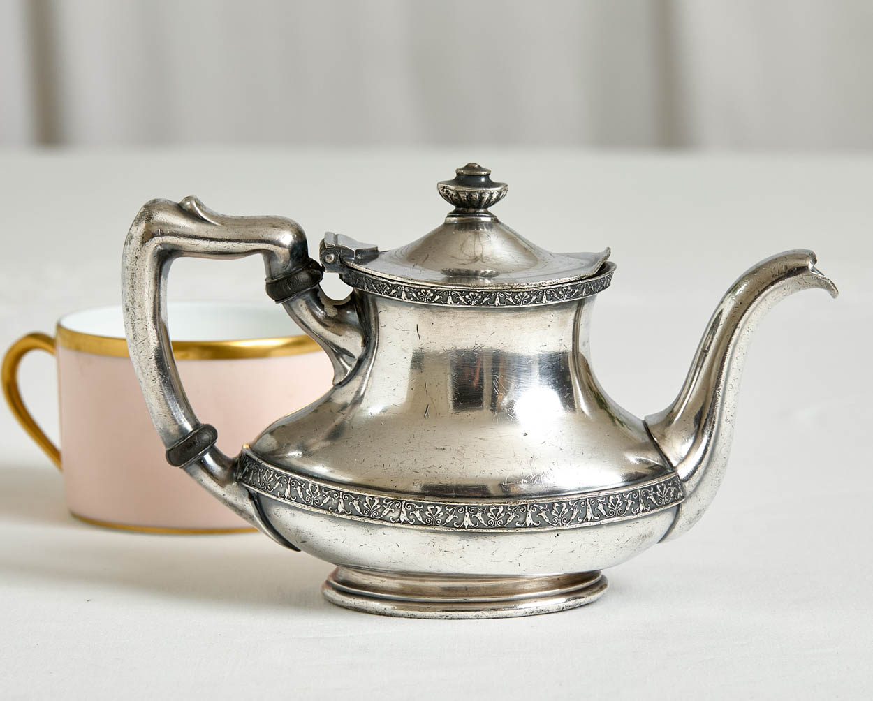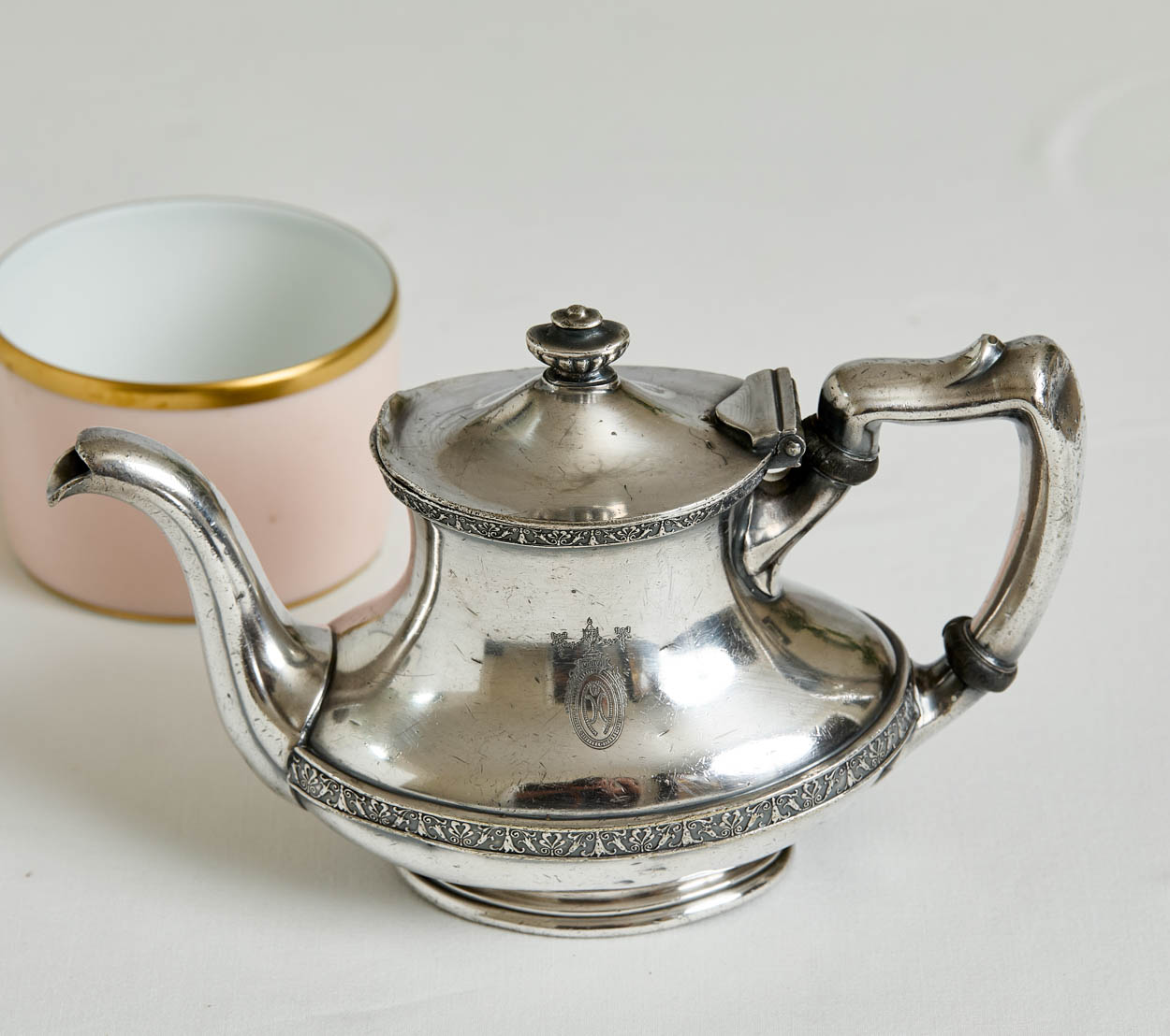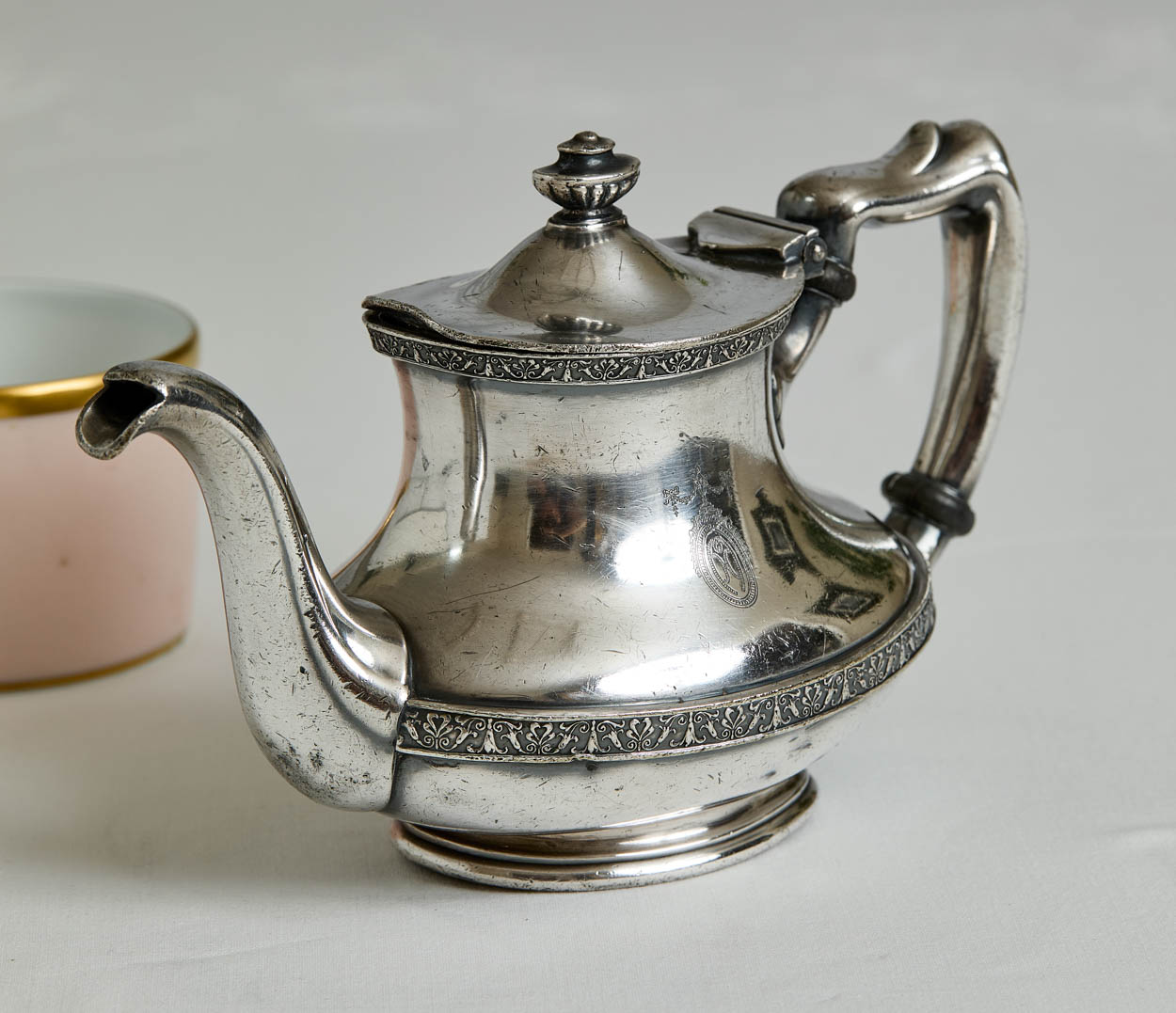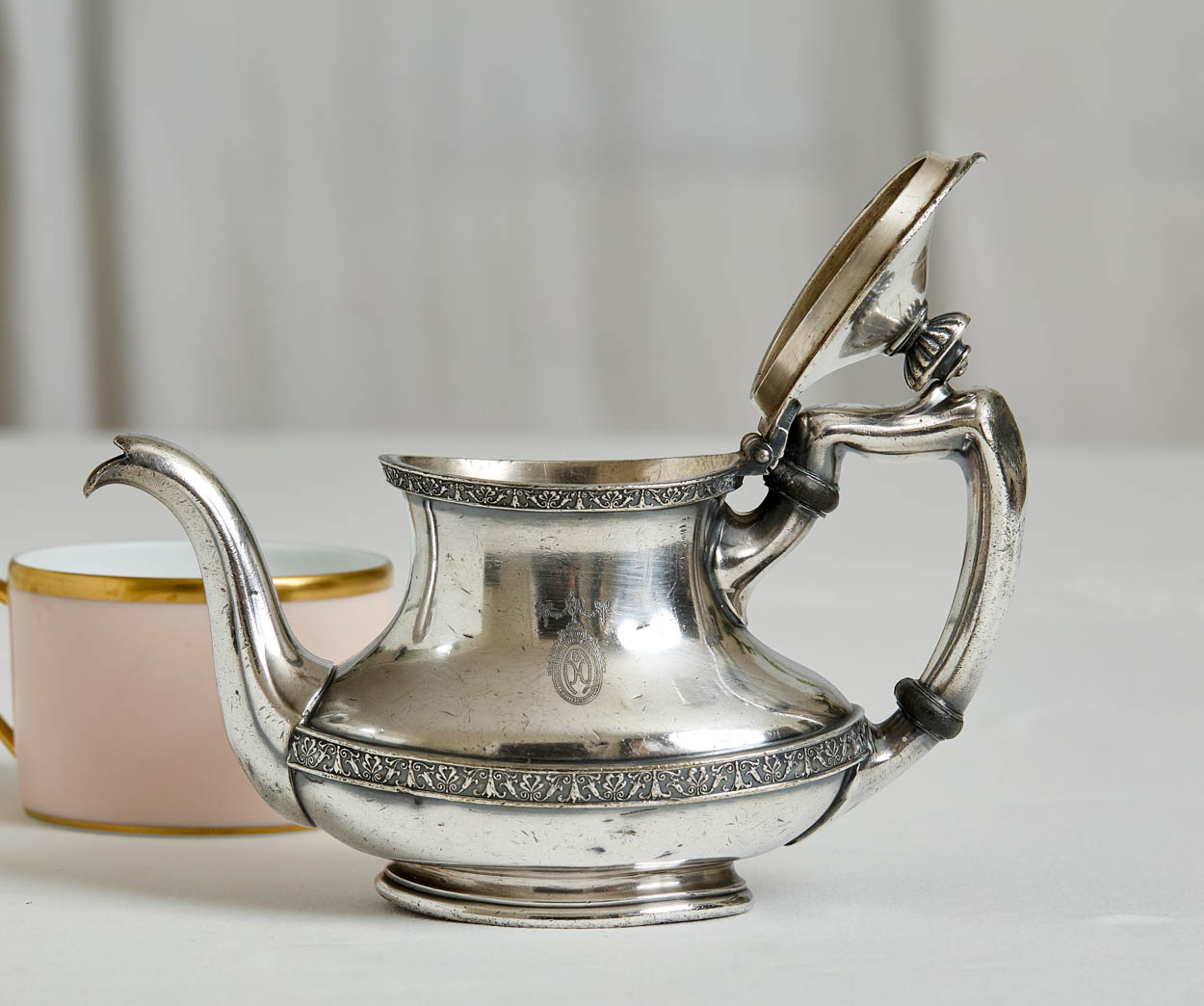 The teapot bears the hotel's crest on the side. It is in overall good condition for its age. It has a ding on the handle and the interior has some wear.