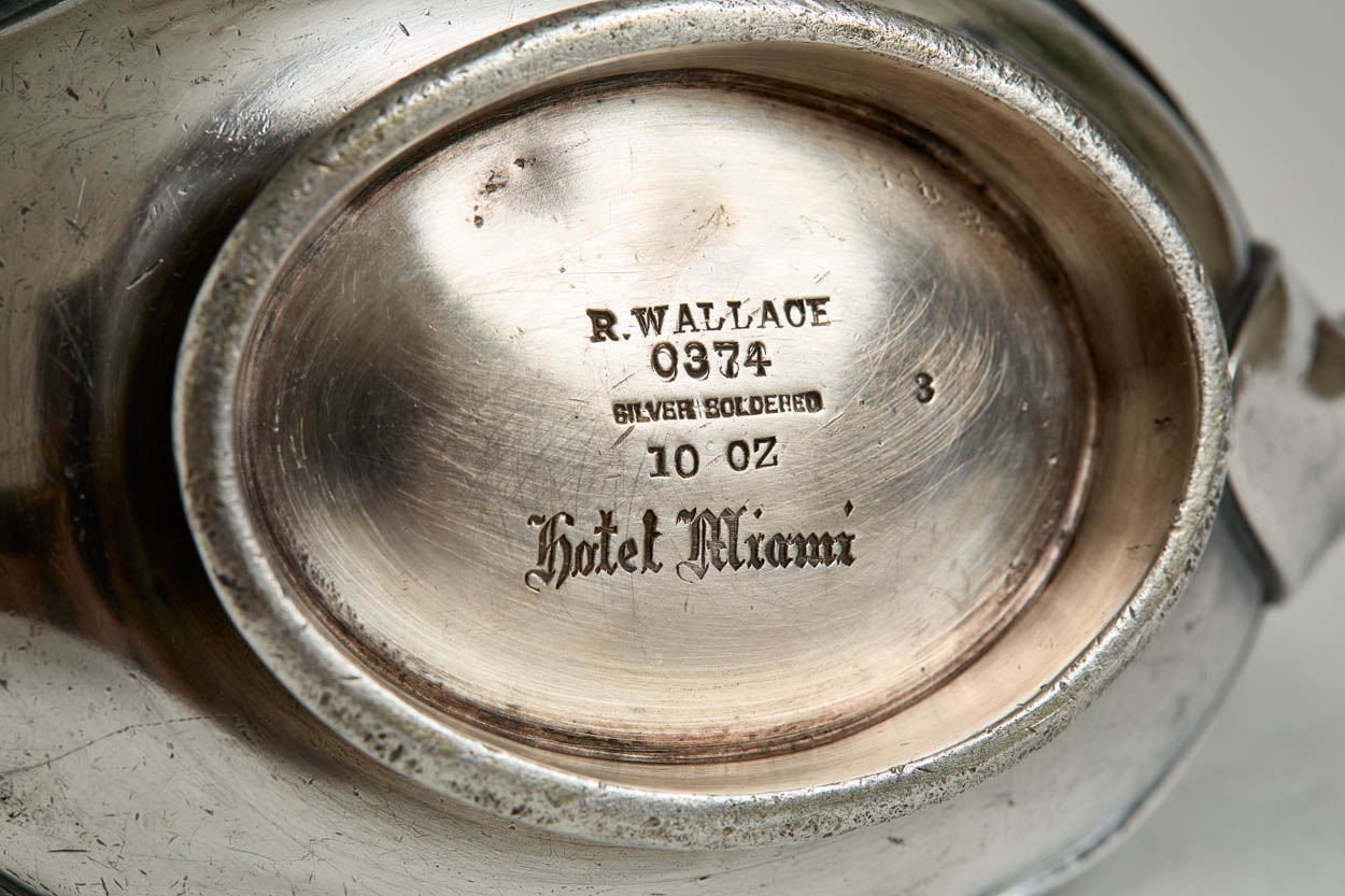 It measures 4-3/4" tall and 6-3/4" from handle to spout. Manufactured by Wallace and stamped, "Hotel Miami."