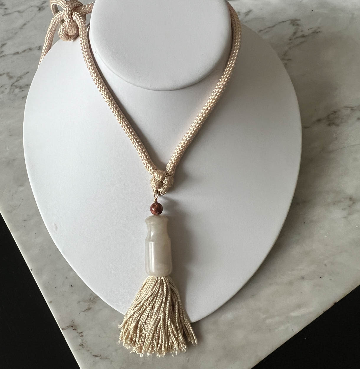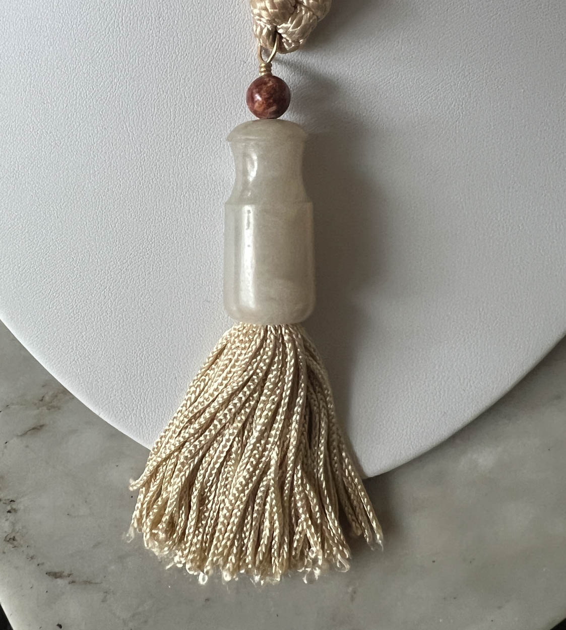 The pendant is on cream-colored cord with a red bead. The tassels hang from the jade bead.