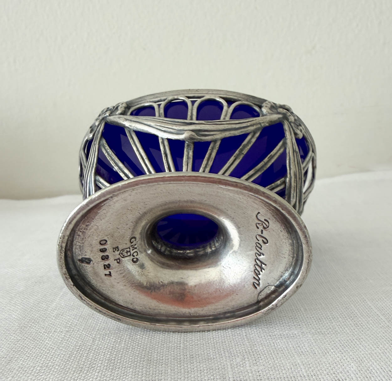 This collectible piece has a silver plate frame with its original cobalt blue glass insert. The base of the cellar has the hotel Ritz's logo.