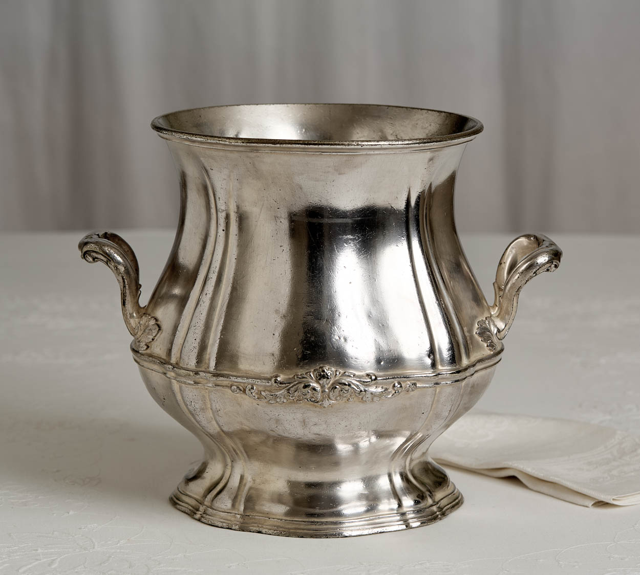 Ornate antique silver plated champagne bucket from the famous Sherman House Hotel.The Sherman House (sometimes called Hotel Sherman) was a hotel in Chicago, Illinois that operated from 1837 until 1973.