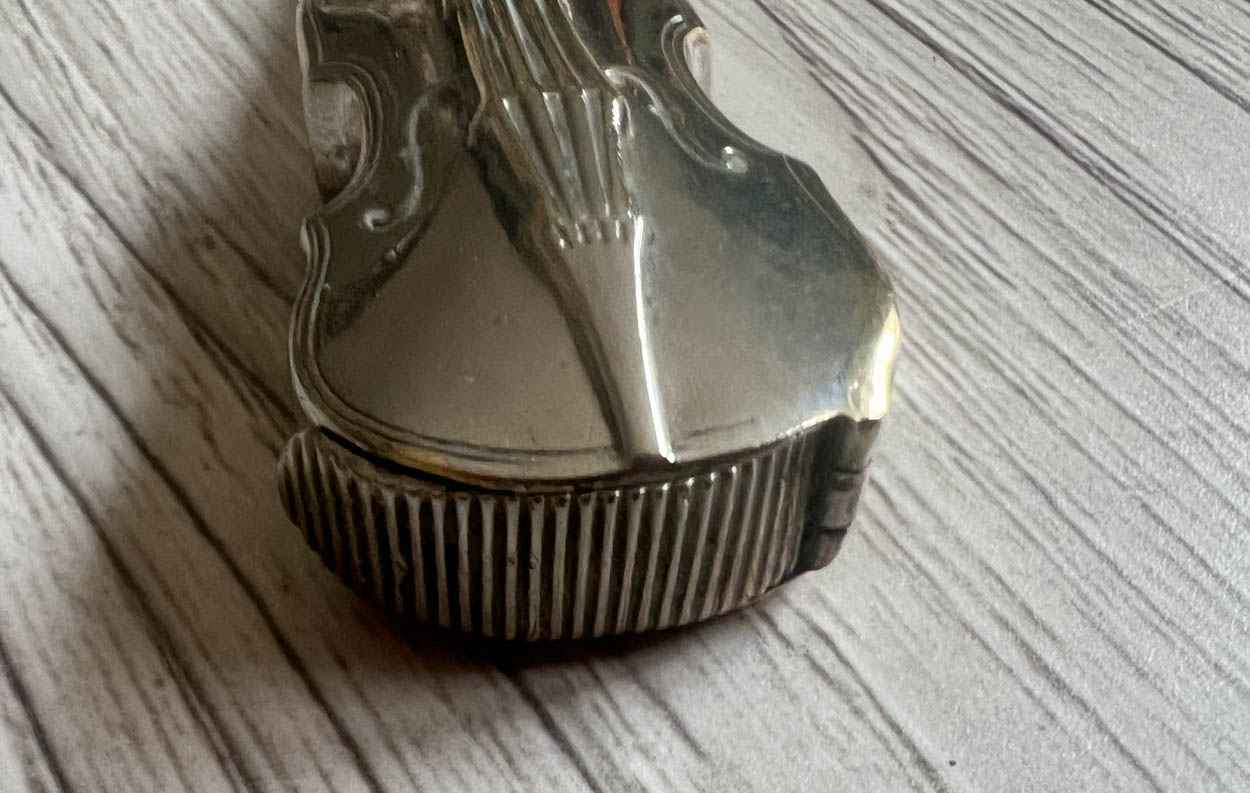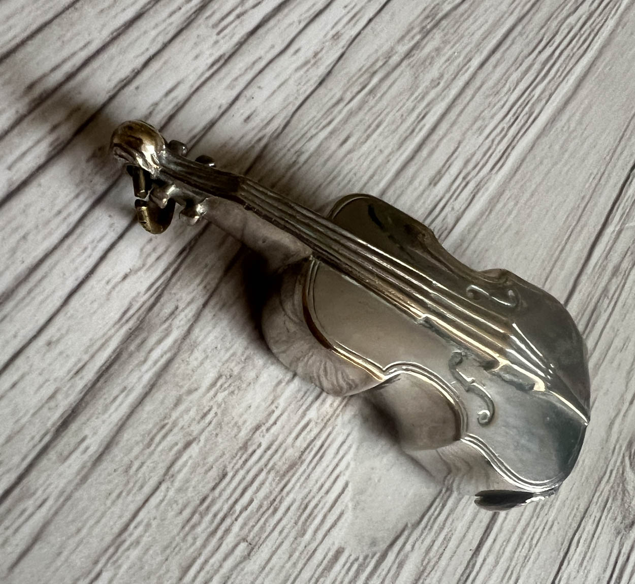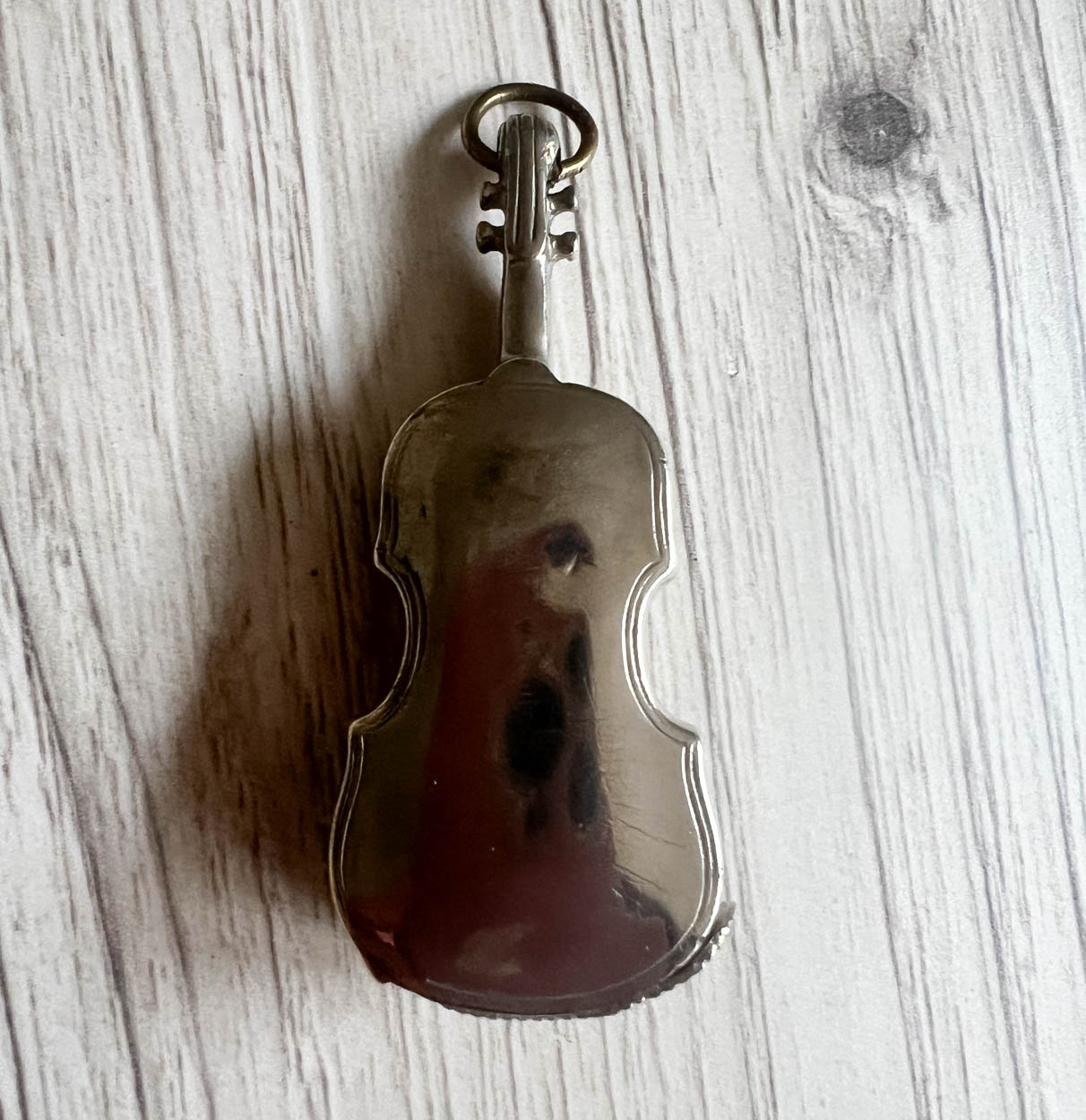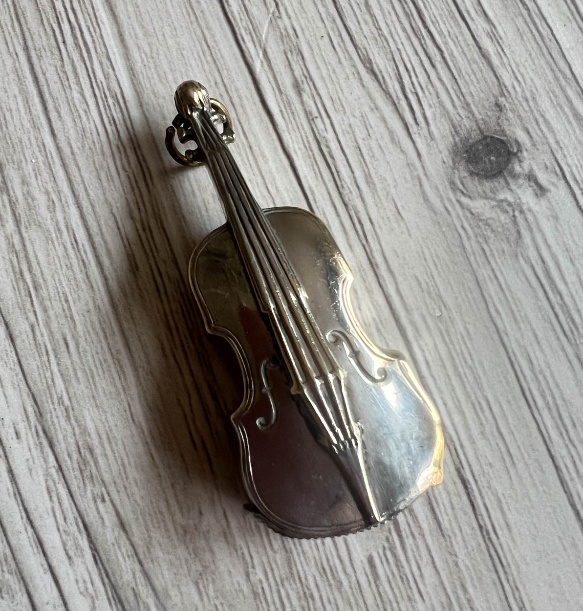 A charming antique silverplated vesta modeled as a cello, captured with wonderful detail.