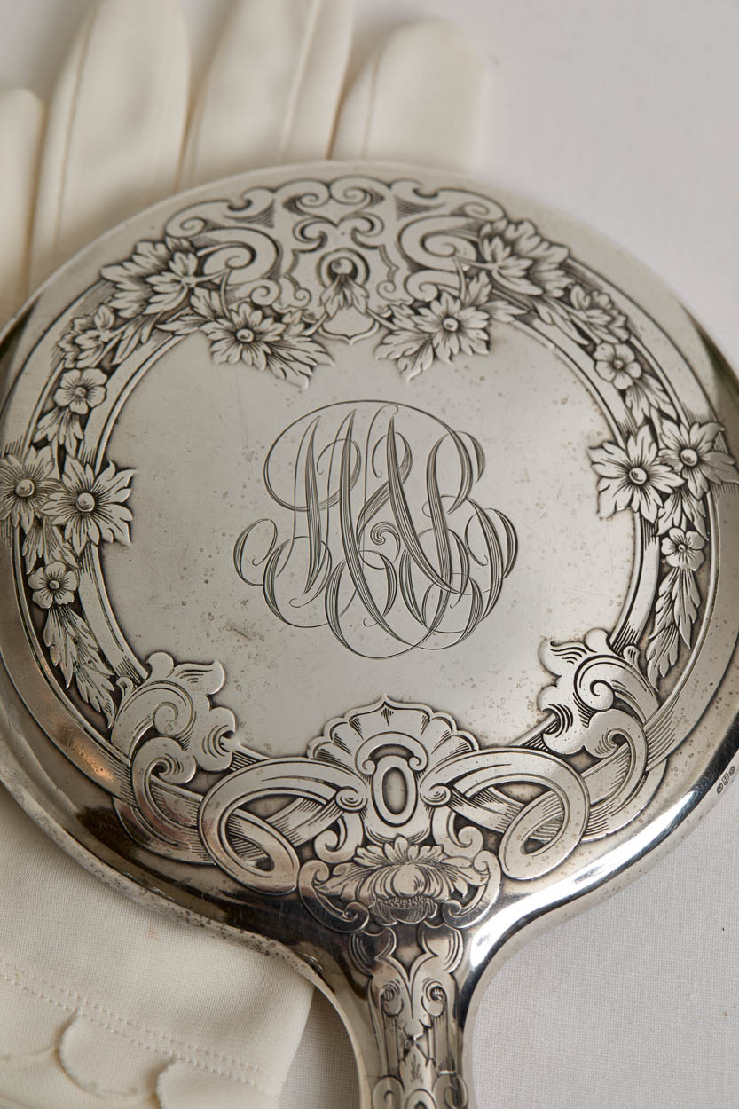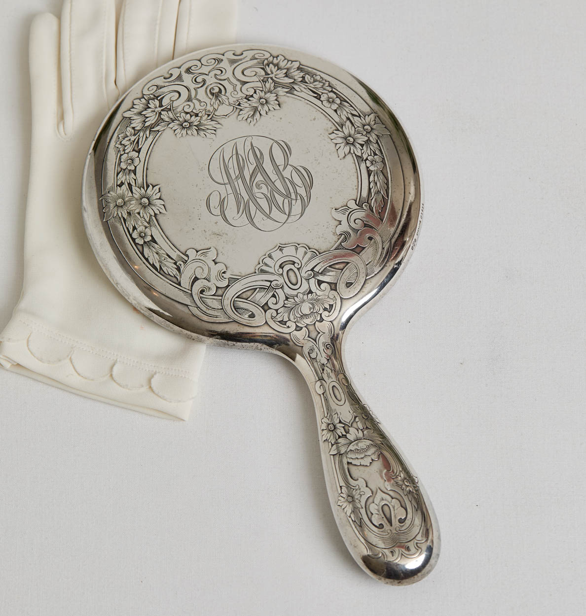 The mirror is monogrammed with lovely hand engraving if flowers.