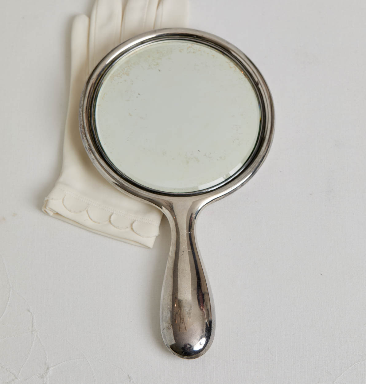 It measures 9-3/4" by 5-1/4" and has a thick handle and a beveled mirror. Stamped, "sterling" with British hallmarks.