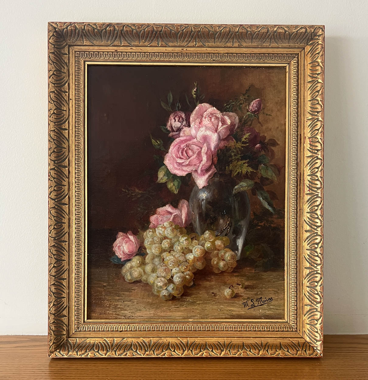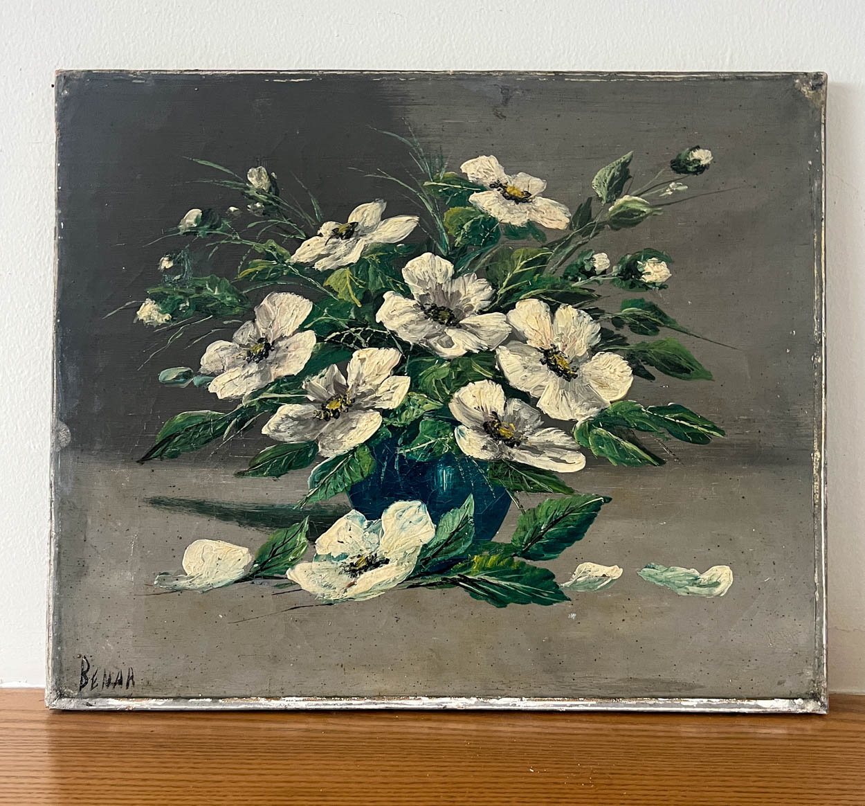 Antique French Floral Dogwood Still Life Oil Painting on Canvas