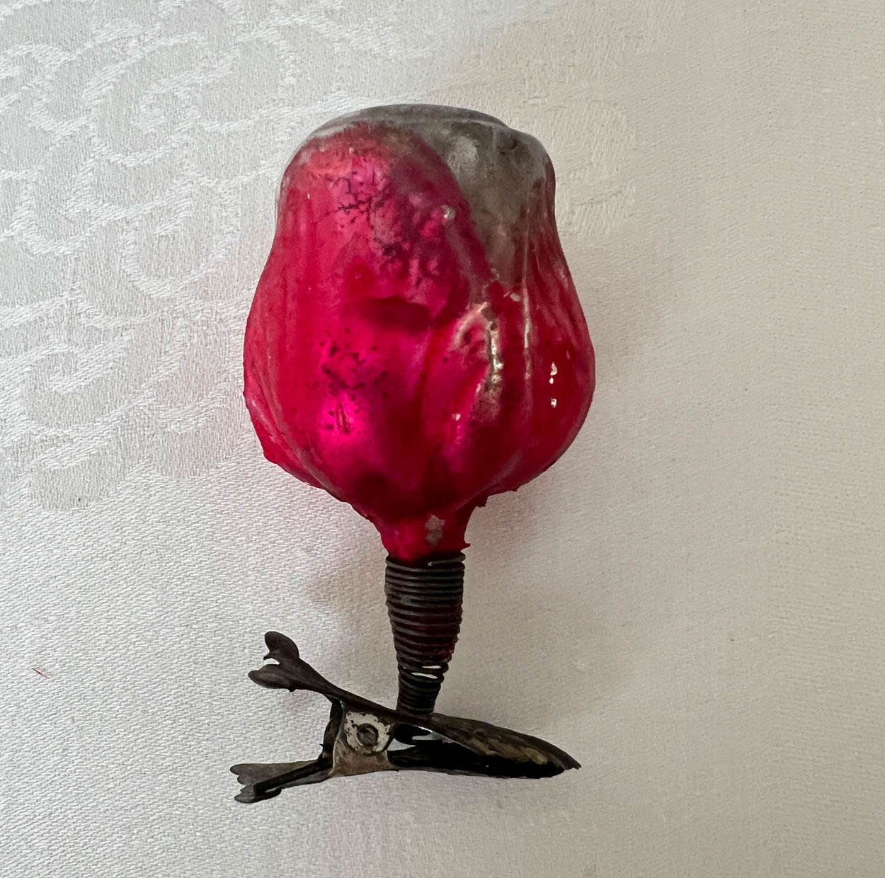 A beautiful early 1900s pink mercury glass rose clip ornament.