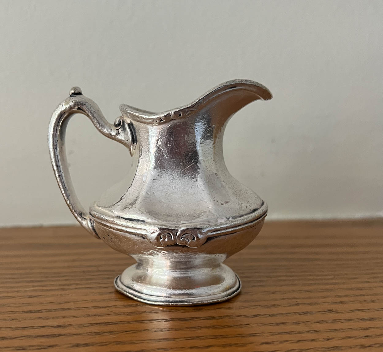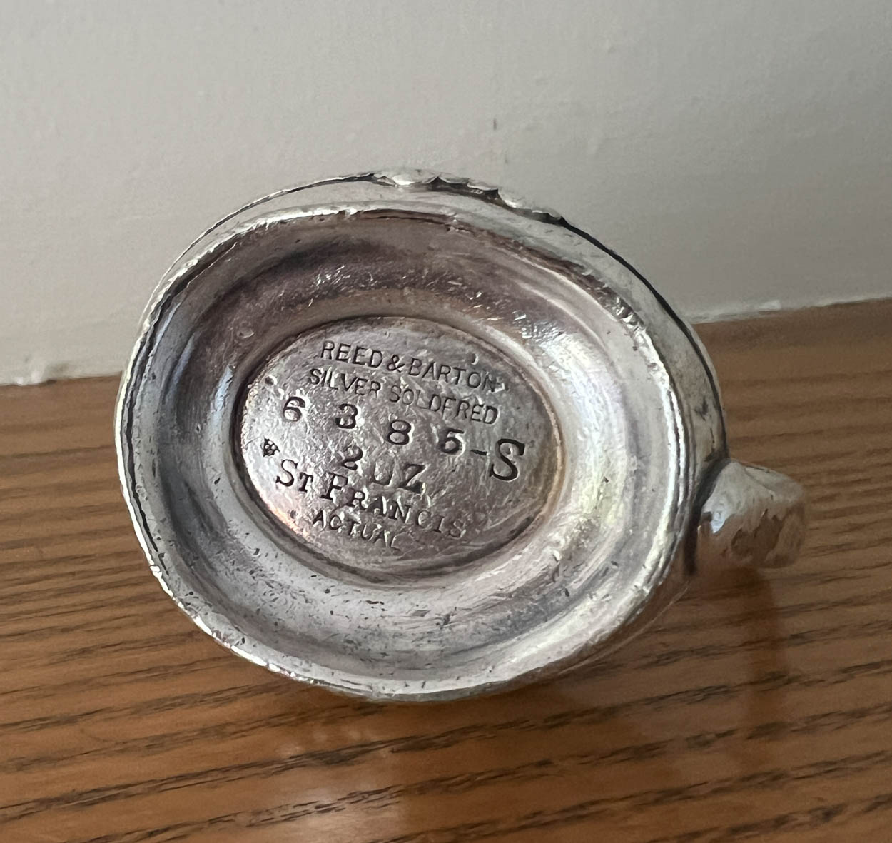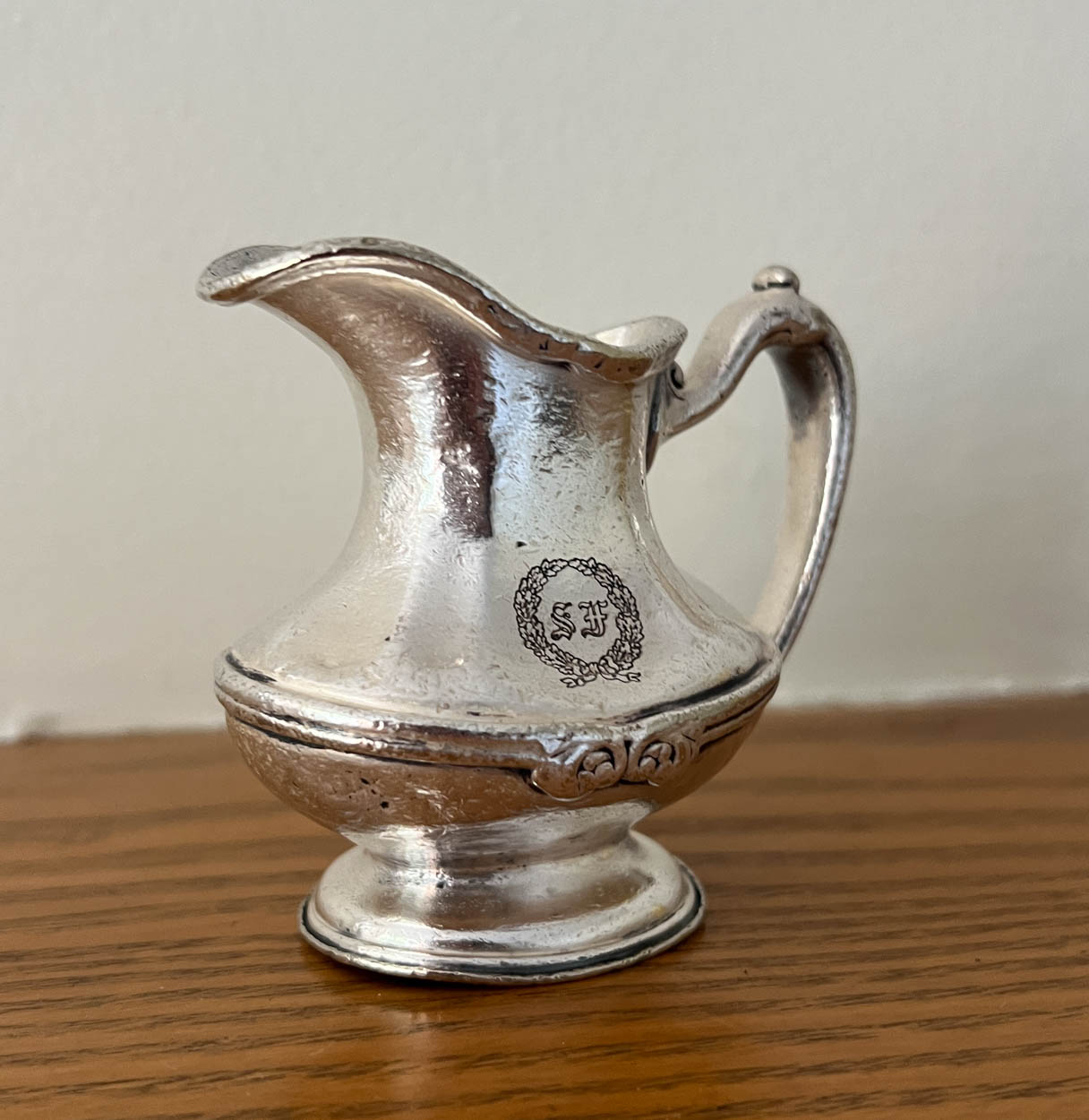 The creamer has the "SF" logo on the side. It has a beautiful butler's patina with some light wear in the interior.