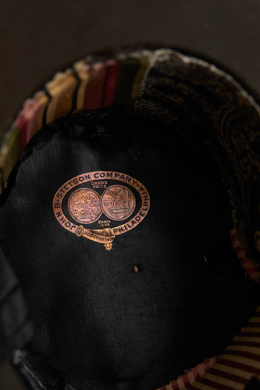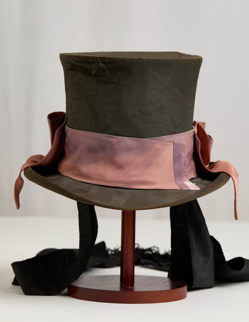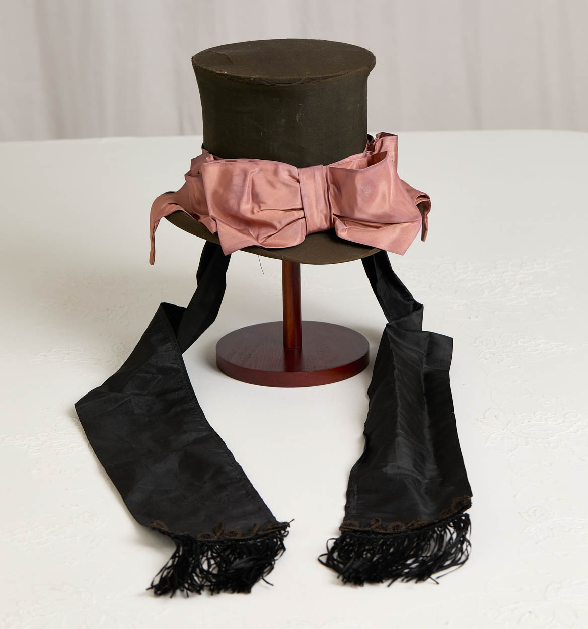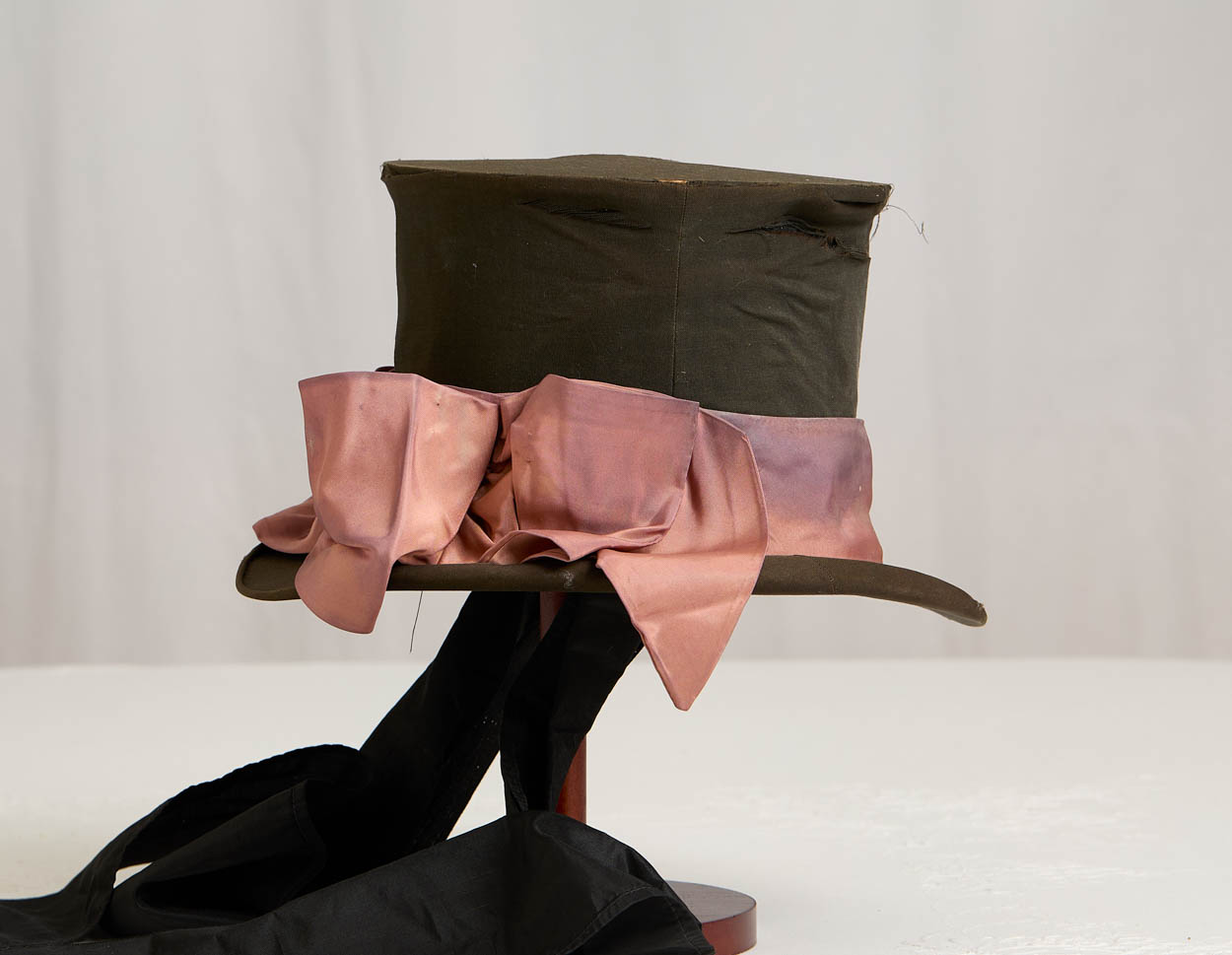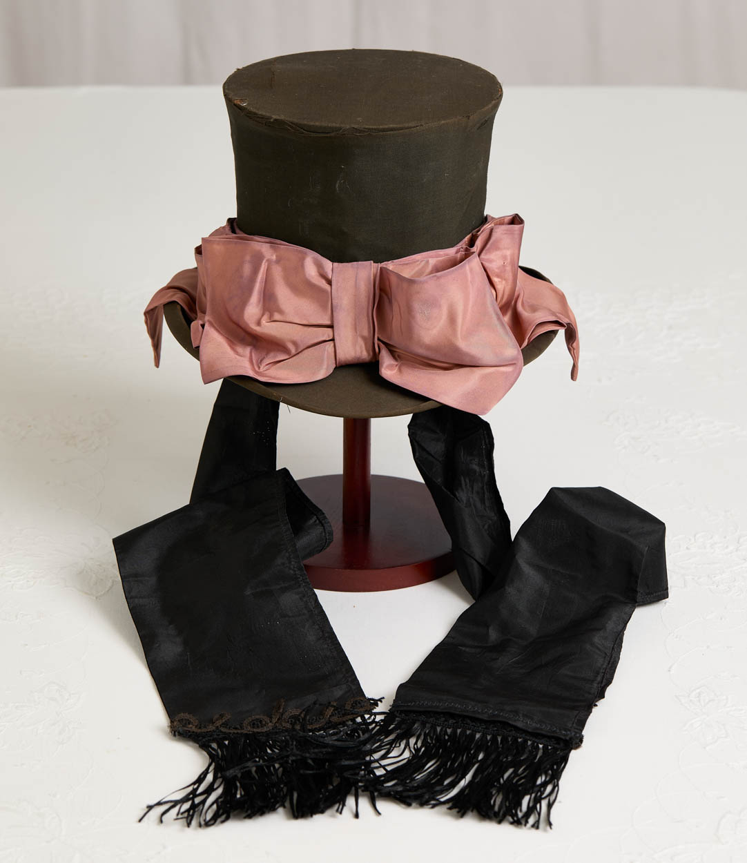 A whimsical, rare Victorian era Stetson beaver skin top hat decorated with a wide pink bow. This would have been used in a parade or as part of a costume.