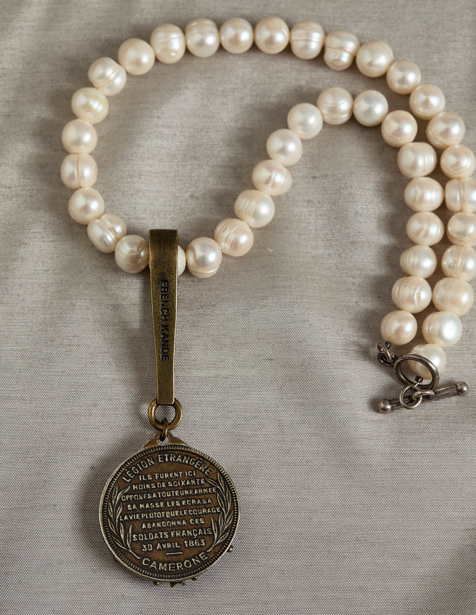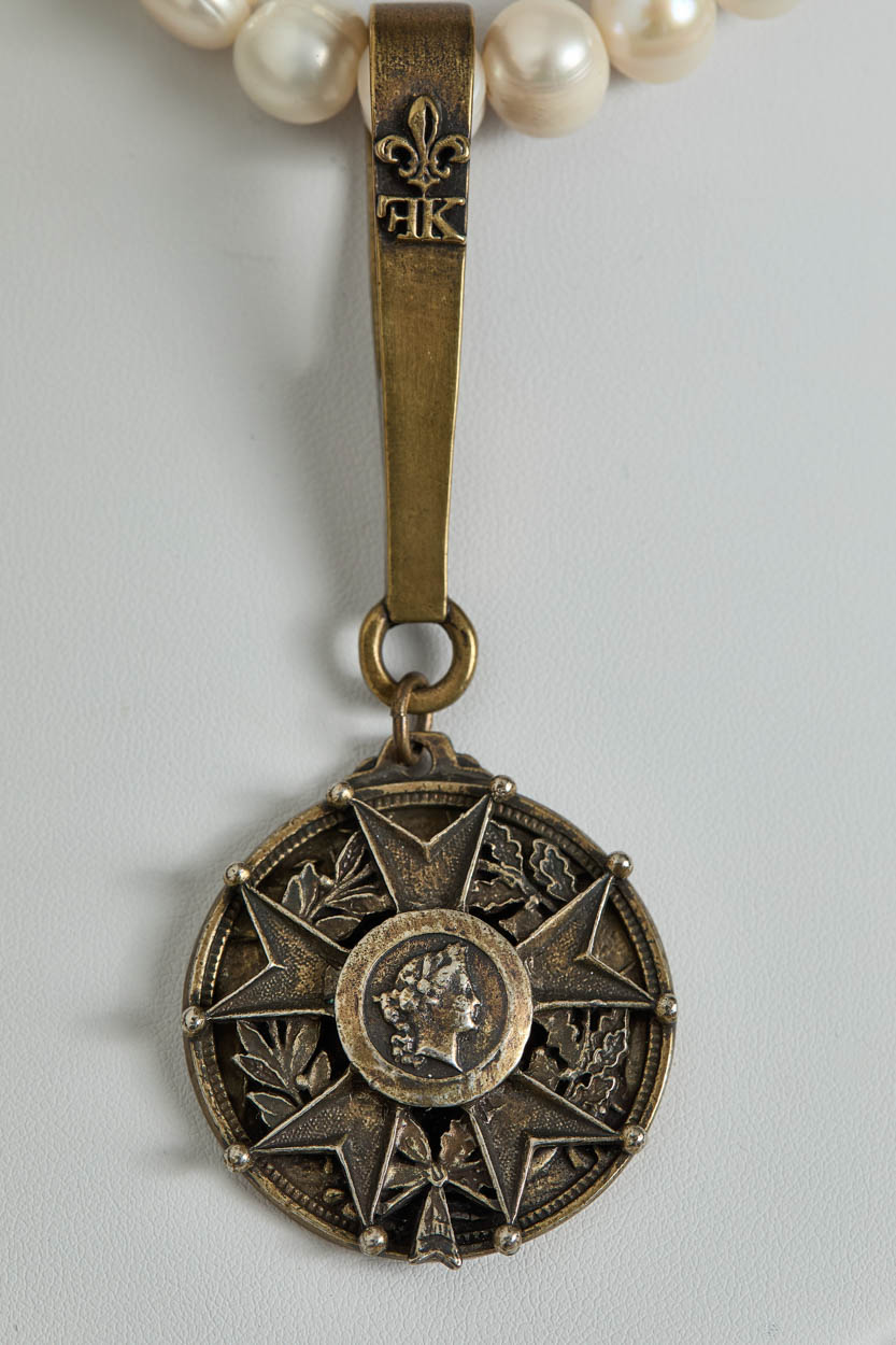 This contemporary pearl and medallion pendant is by French Kande. We just love how French Kande makes replica French medallions for their jewelry line! Their jewelry makes such great statement pieces.