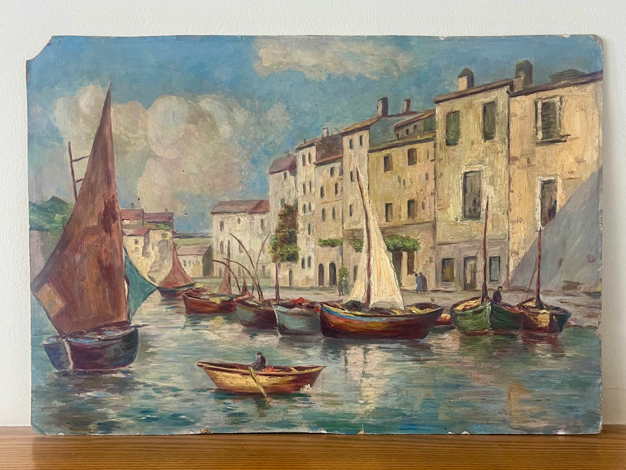1930s French Boats Oil Painting on Board