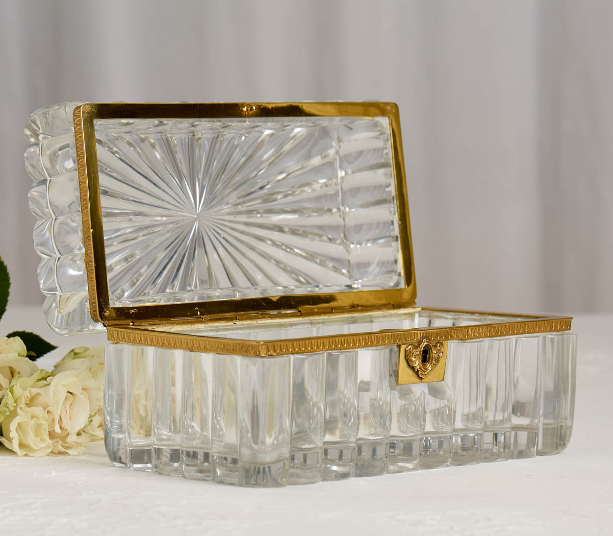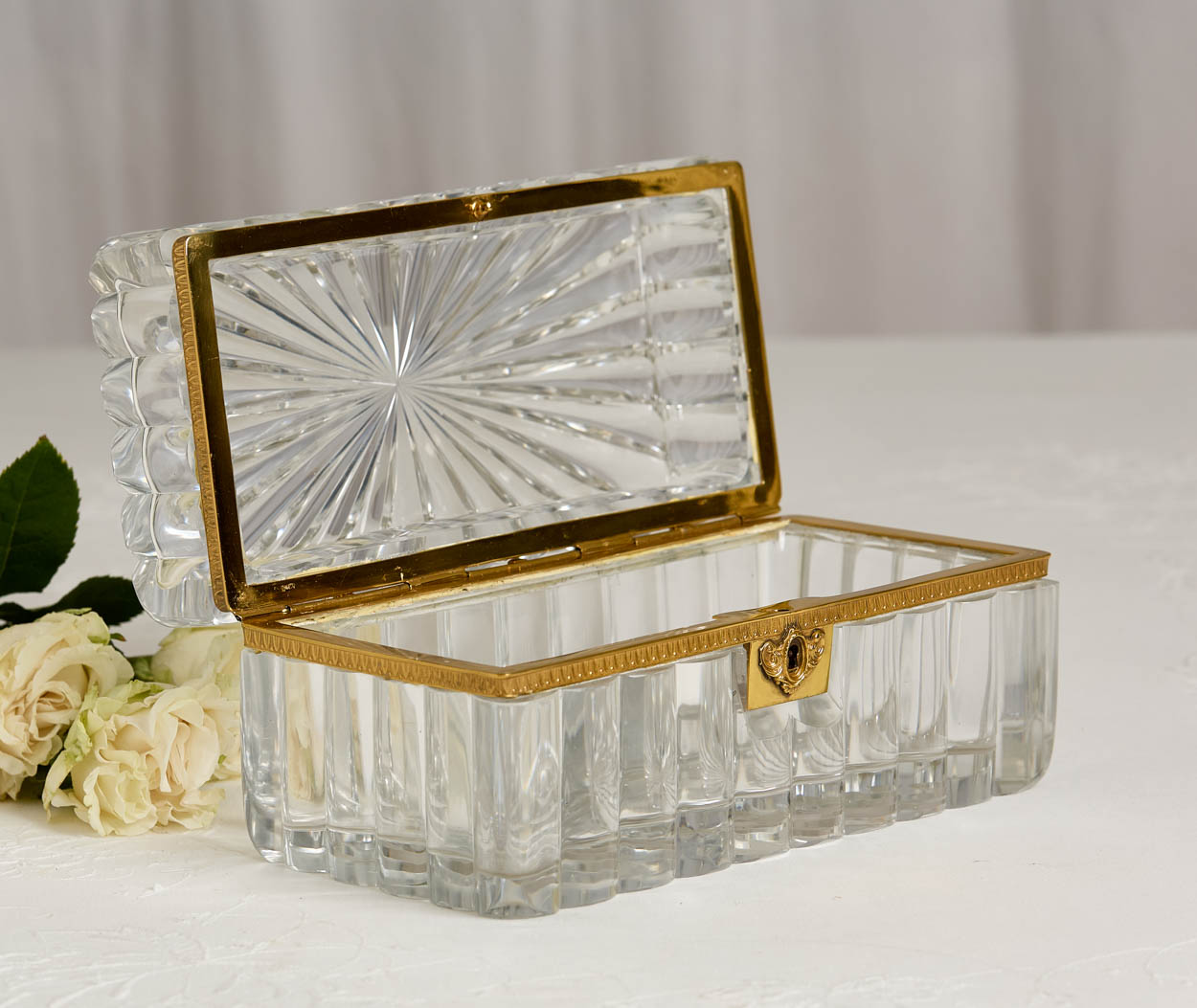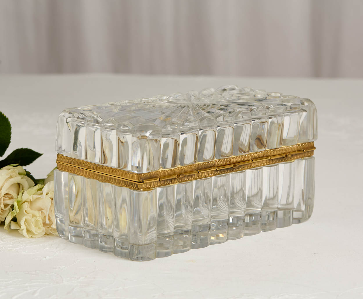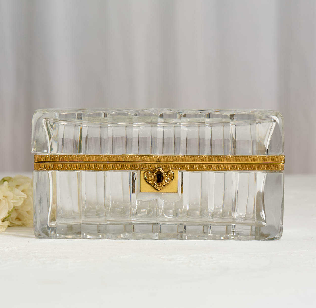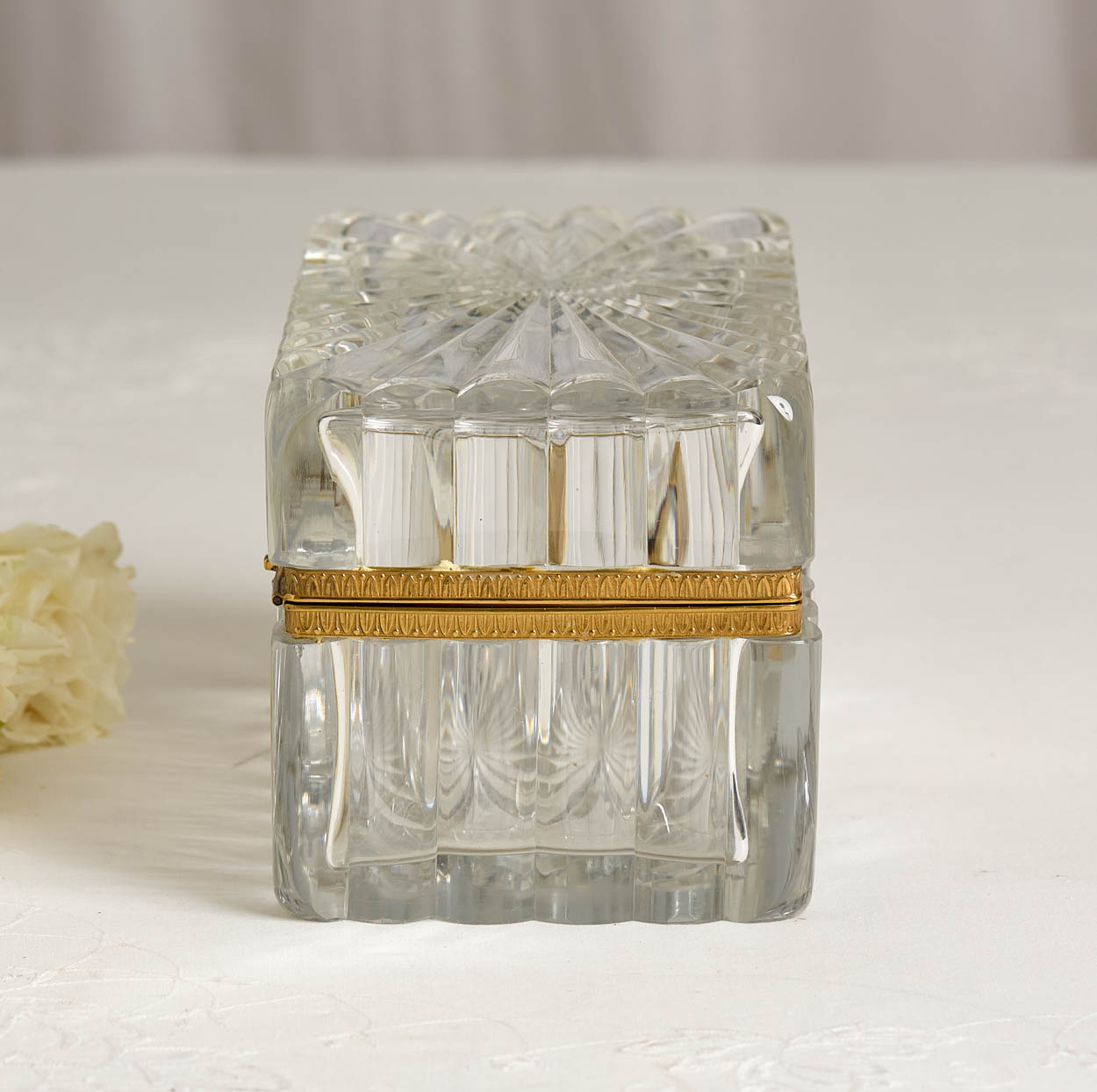 Thi box has a streamlined gilt brass mount, adding a luxurious contrast to the crystal's clarity. The hinged design ensures easy access, while the conforming base provides stability and complements the overall aesthetic.