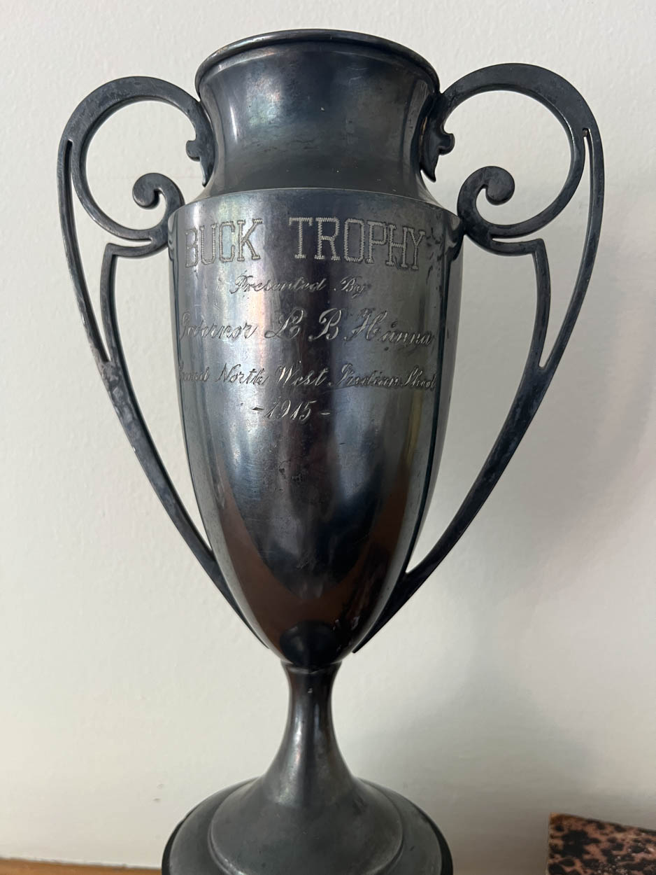 The trophy is inscribed, "BUCK TROPHY Presented by Governor LF Hainna Second North West Indian Shoot 1915".