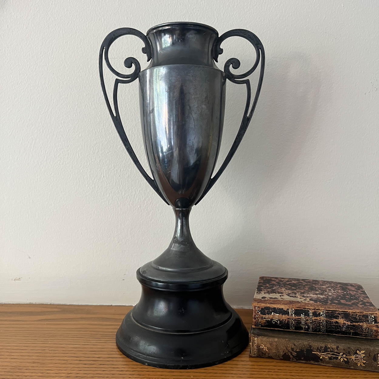 It's quite a heavy trophy with fancy handles. We've left it unpolished in the event that you like the aged patina.