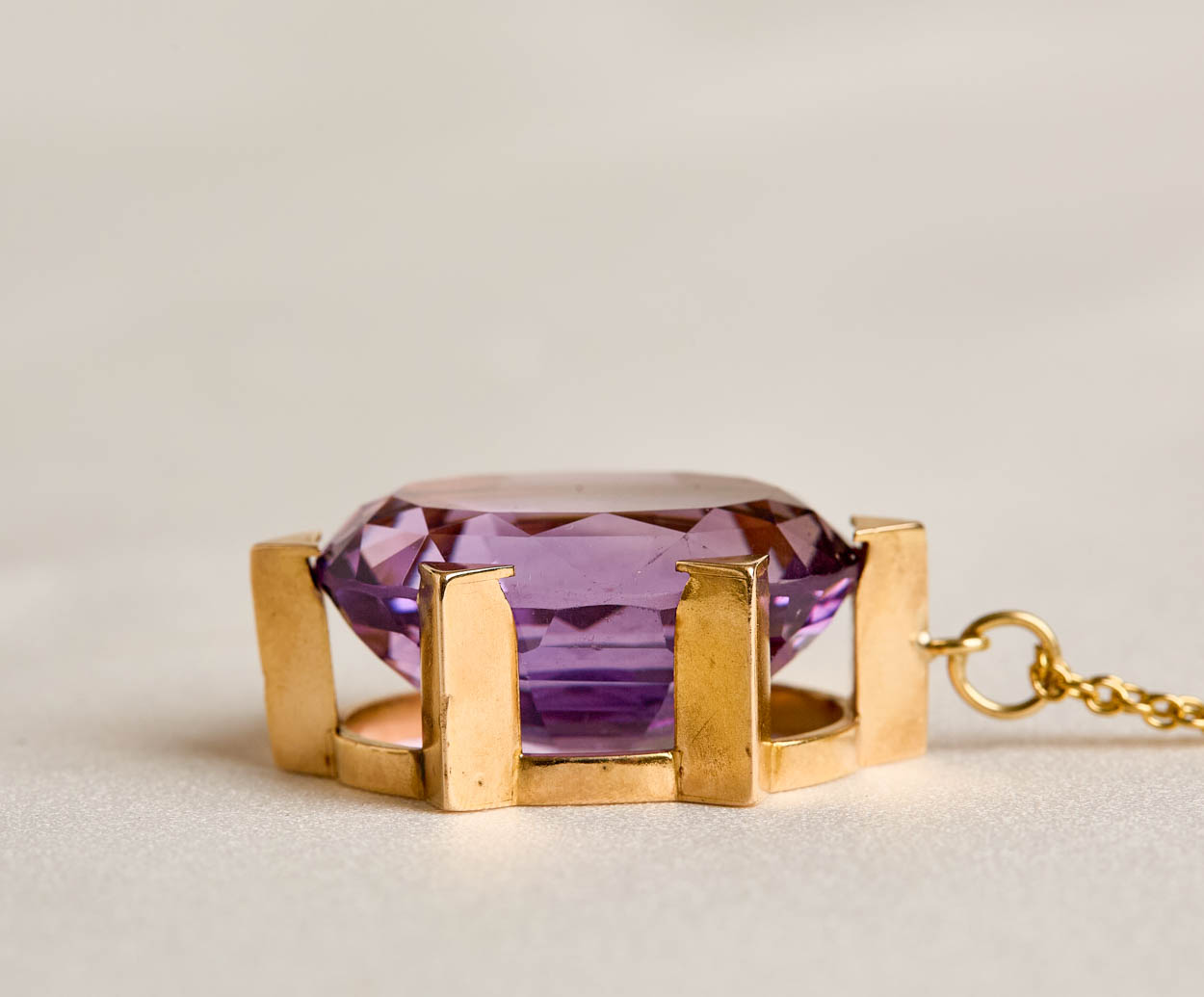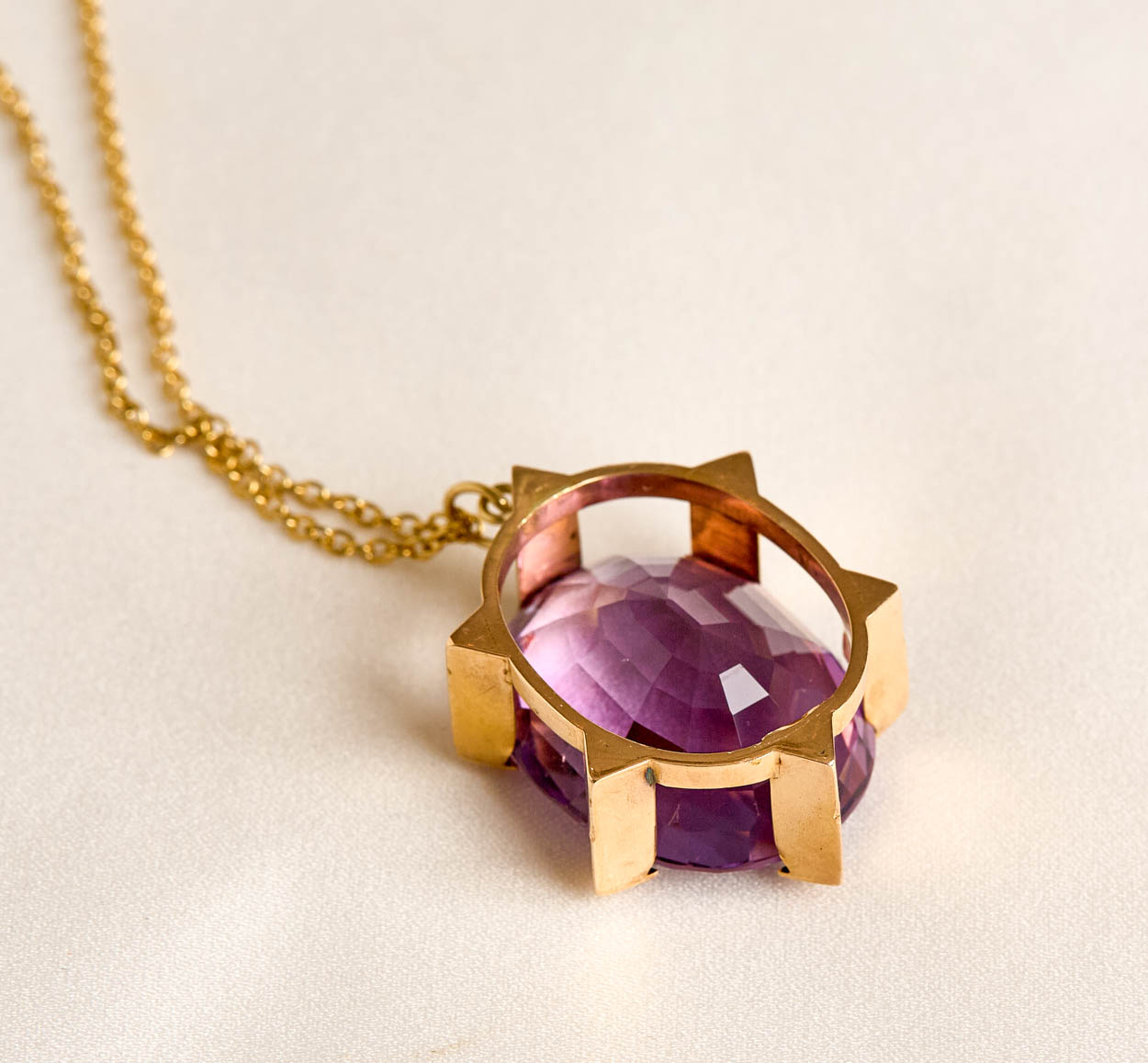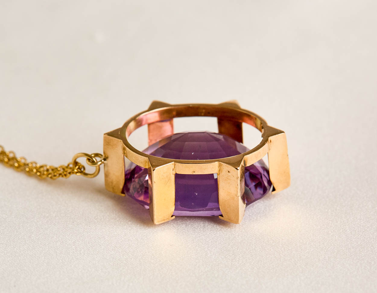 A striking, chunky 1940s Rose de France amethyst pendant set in 14K yellow gold.