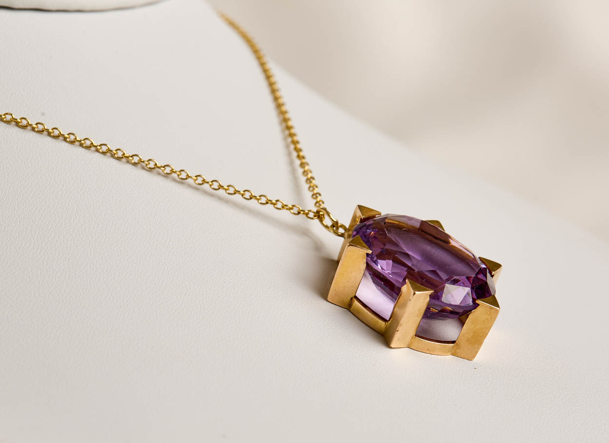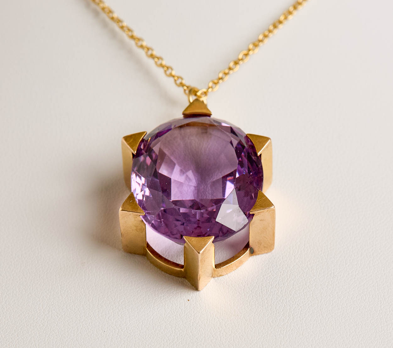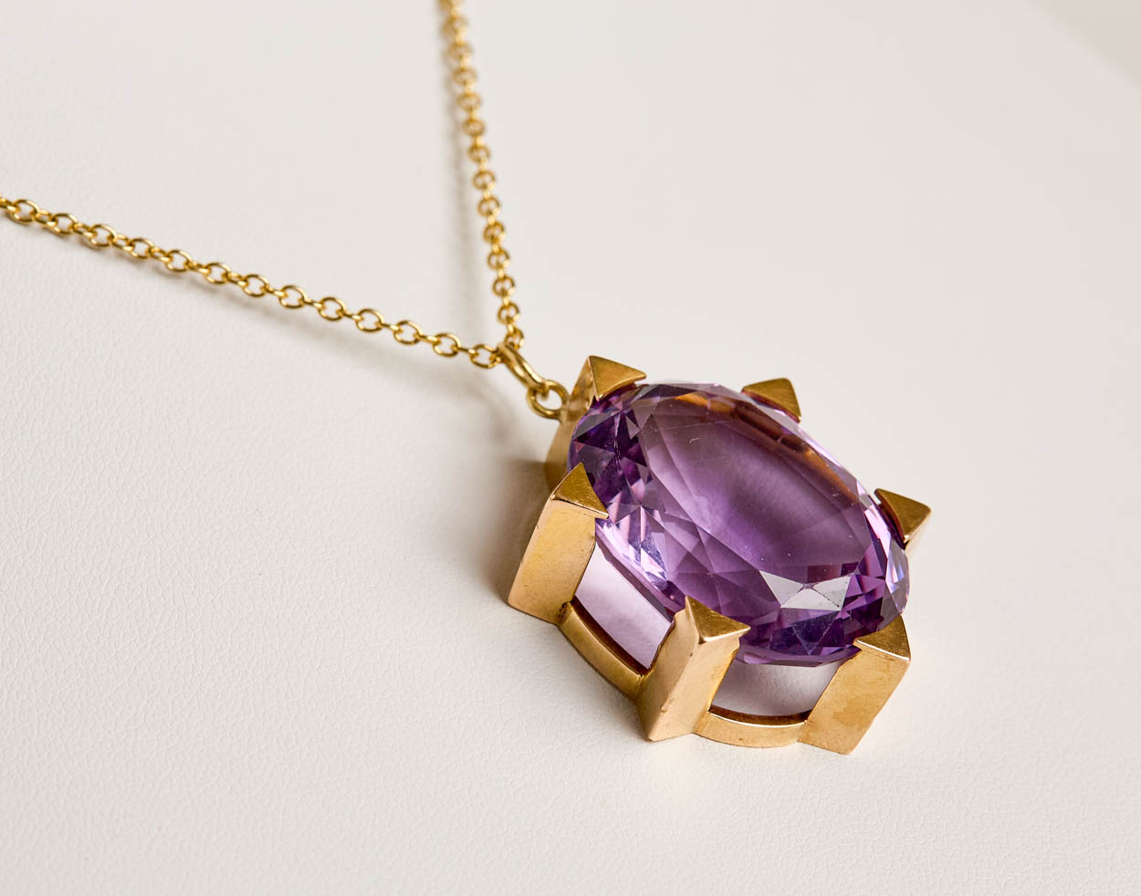 A striking, chunky 1940s Rose de France amethyst pendant set in 14K yellow gold.