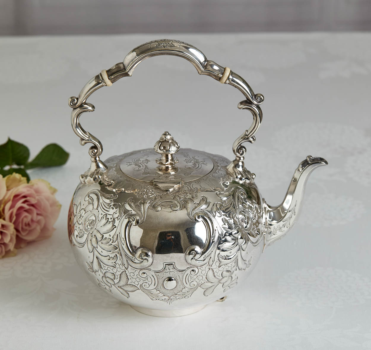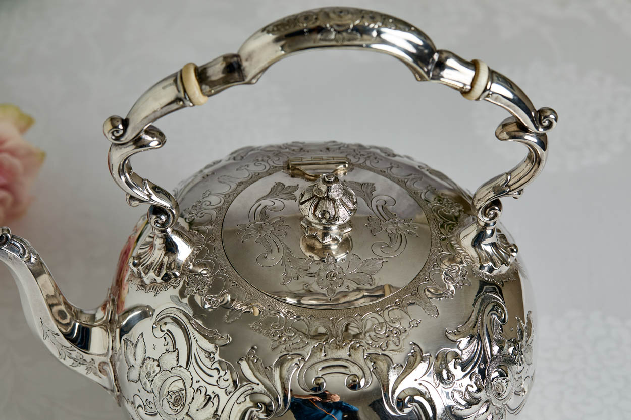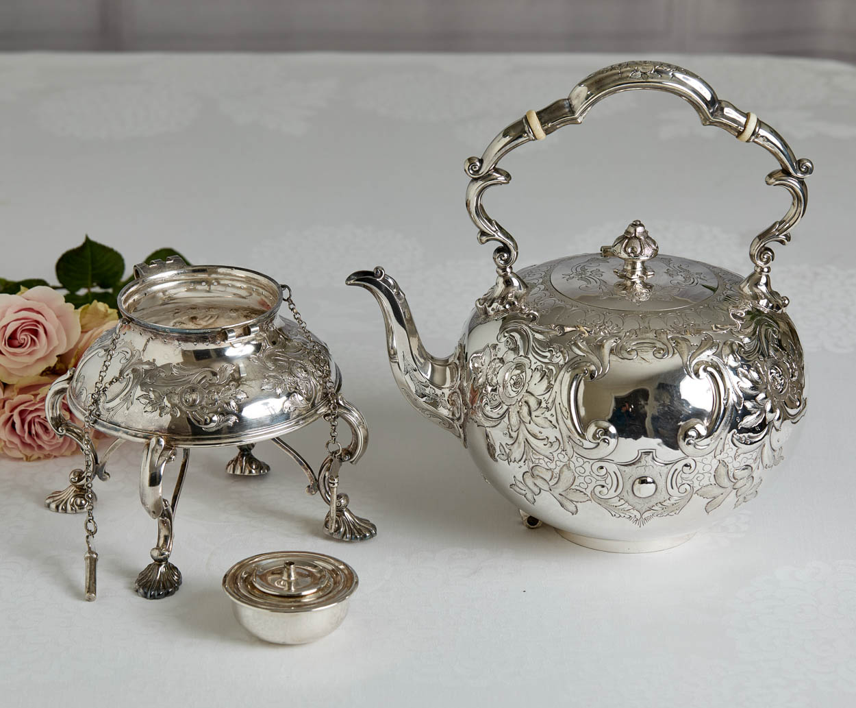 Acquired from an old estate, a grand English 19th century silver plated repousse tilting kettle.