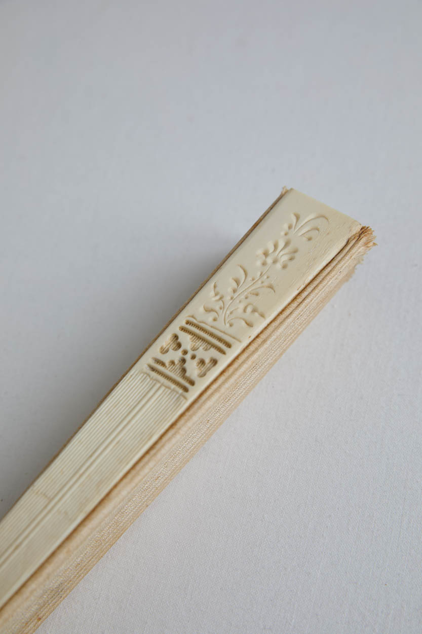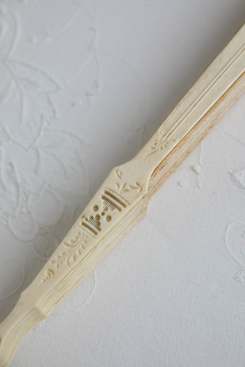 The fan has carved ivory and is in pristine condition. The floral motif is pastel and lovely on the ivory silk.