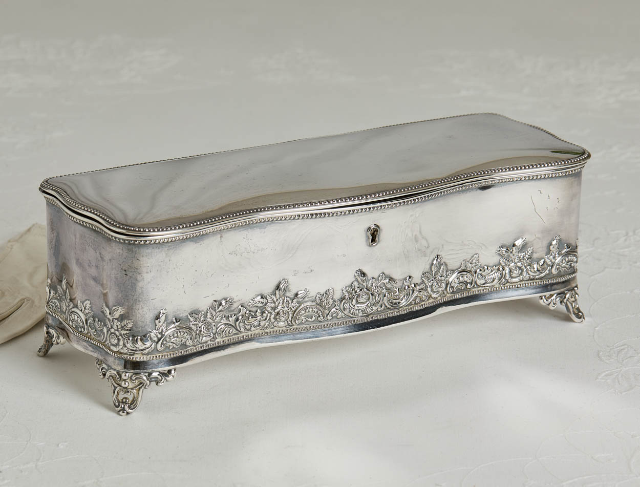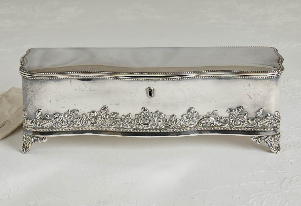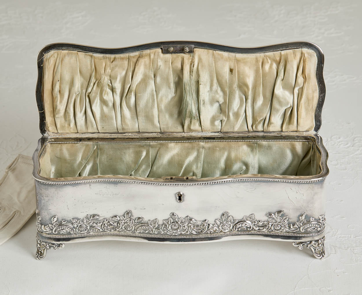 The box has lovely repousse along the base and feet. The inside has a pretty pale green silk interior. Beading along the top and edges.