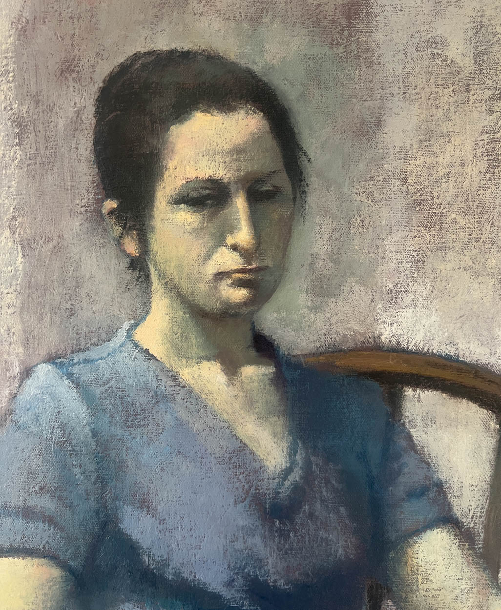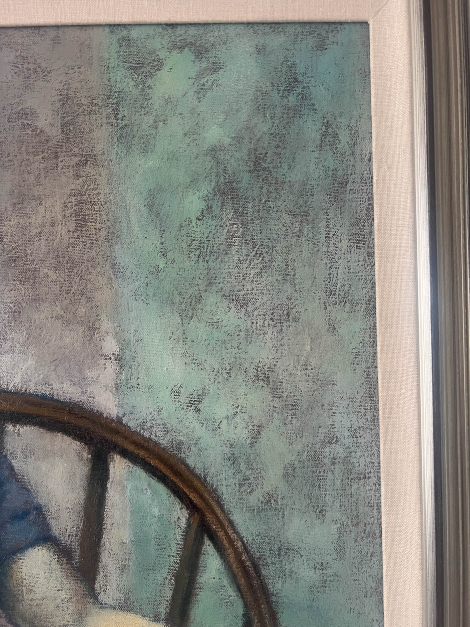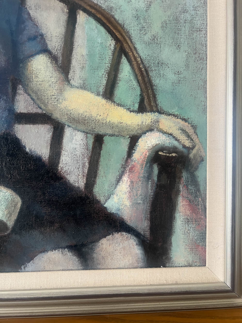 The painting is of a woman in a chair holding a cup. It's beautifully executed and the colors are quite pleasing.