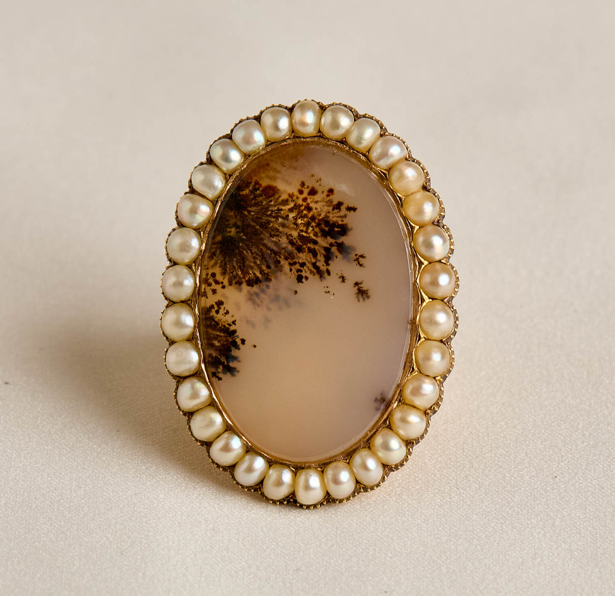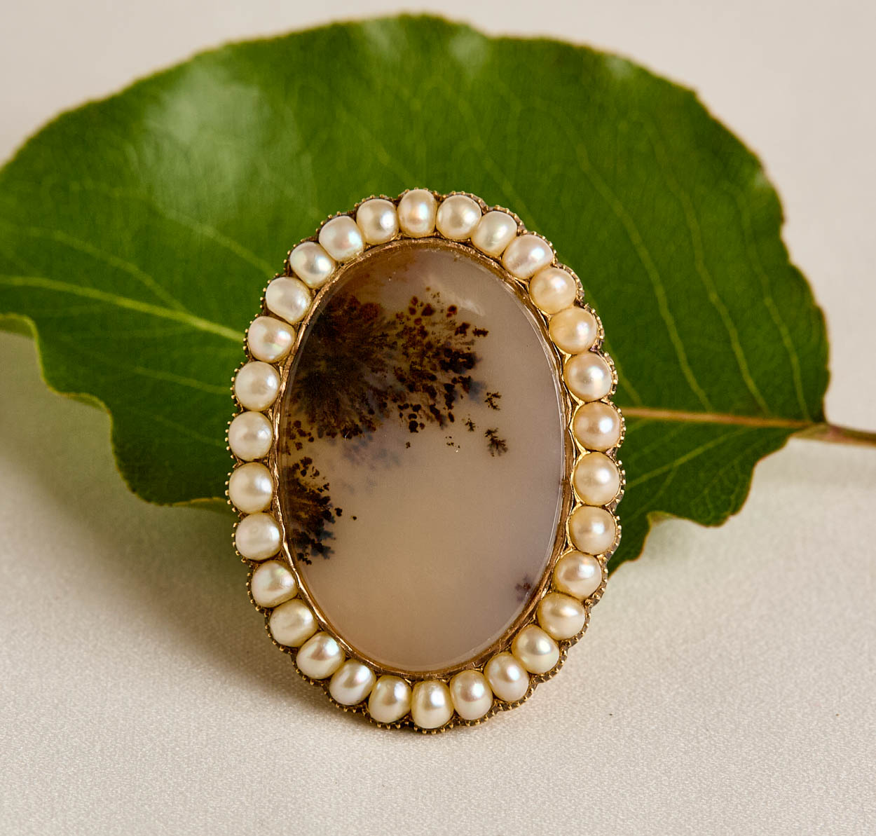 This massive Victorian dendritic agate ring is surrounded by natural pearls and set in 14K gold. It truly enormous!