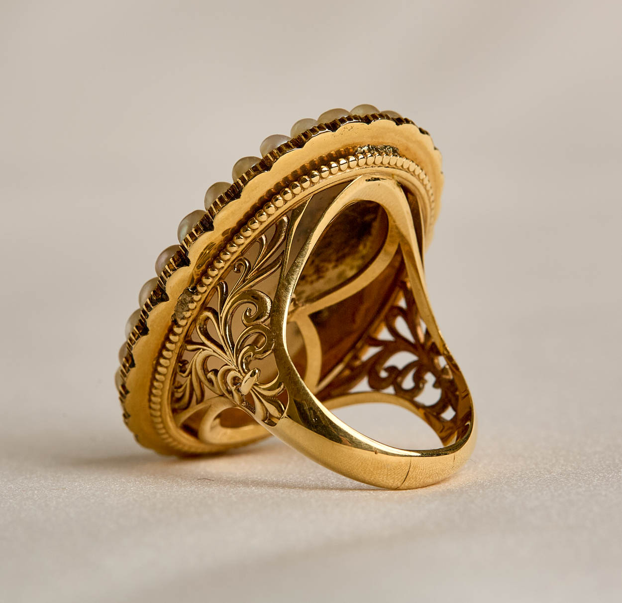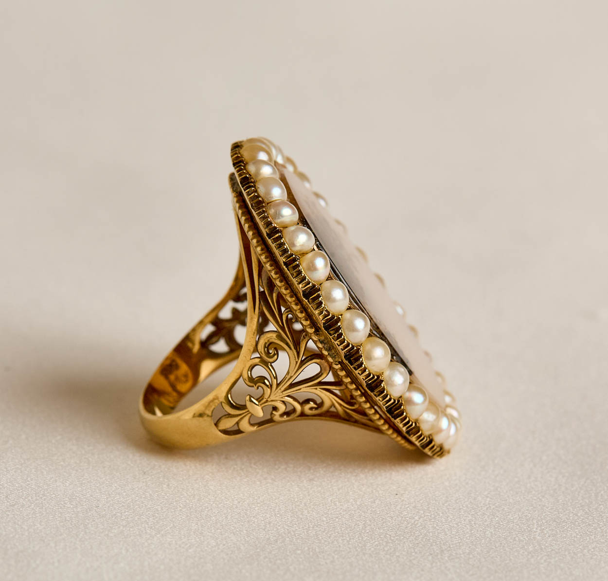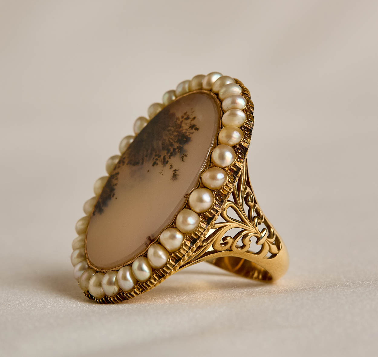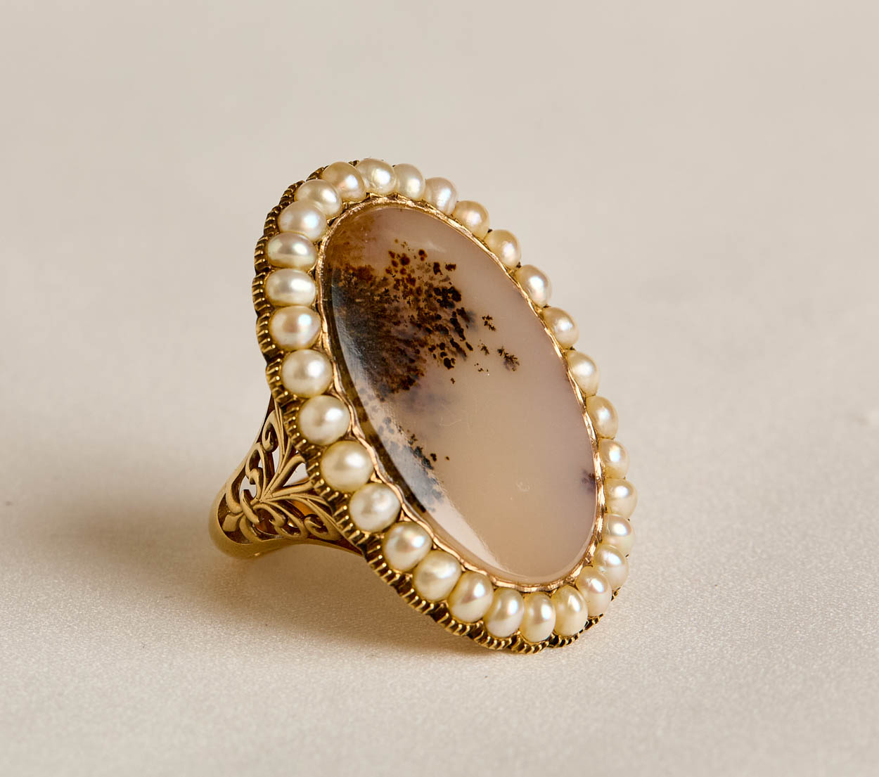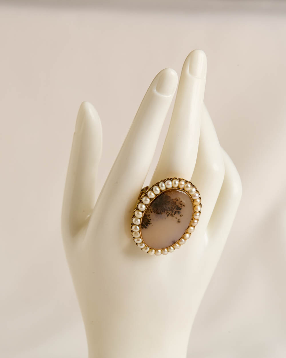 Massive Rare Victorian 14K Gold Dendritic Agate Natural Pearl Ring
