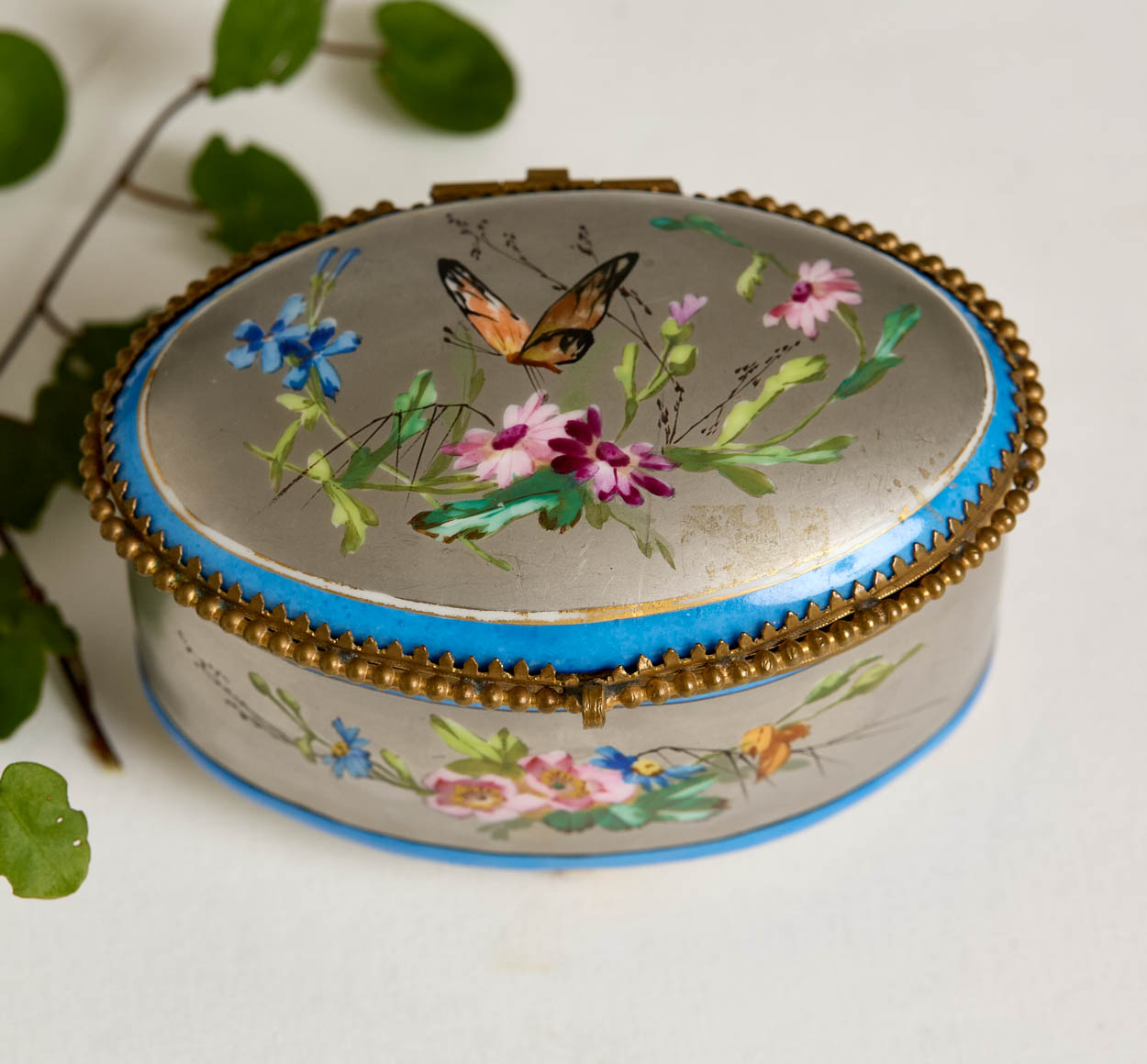 19th C. French Silvered Porcelain Floral Trinket Box