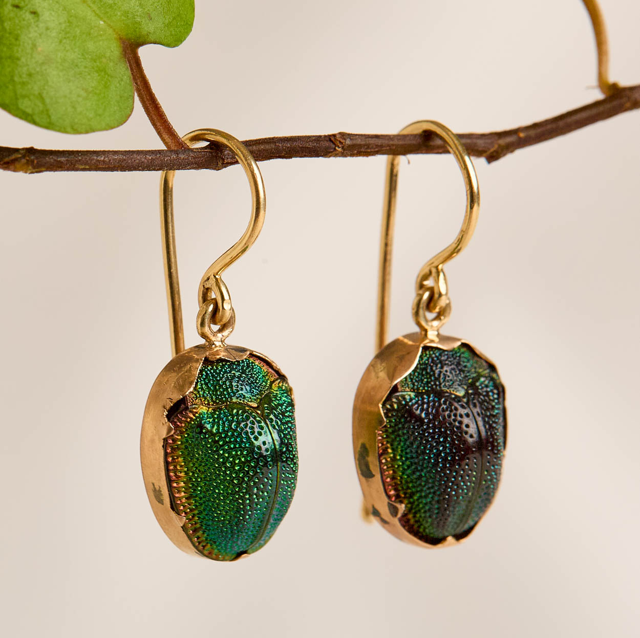Pair of Victorian 10K Gold Real Scarab Beetle Earrings, 14k Gold Wires