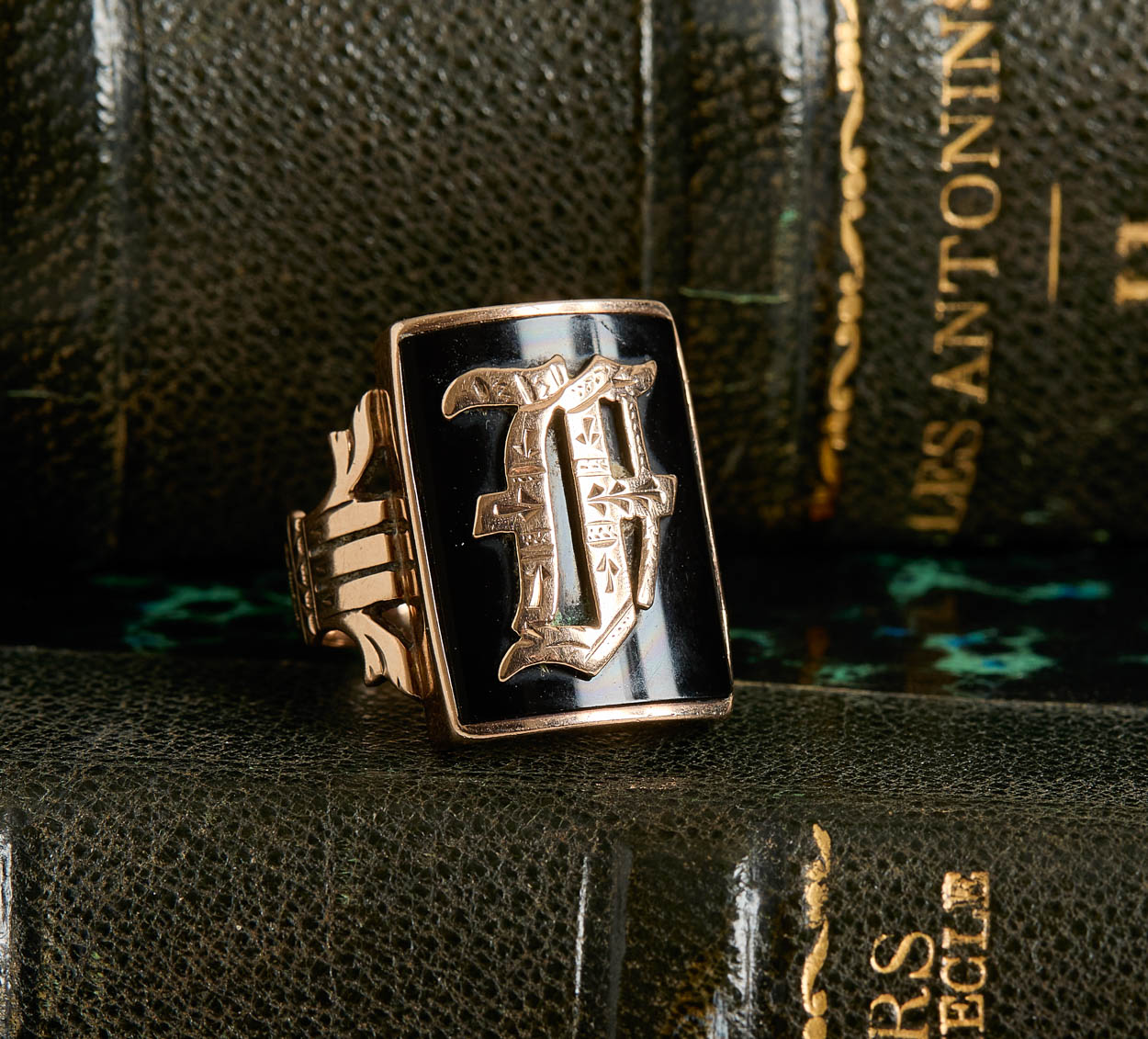 Art Deco 10K Gold Onyx Monogrammed F Initial Ring