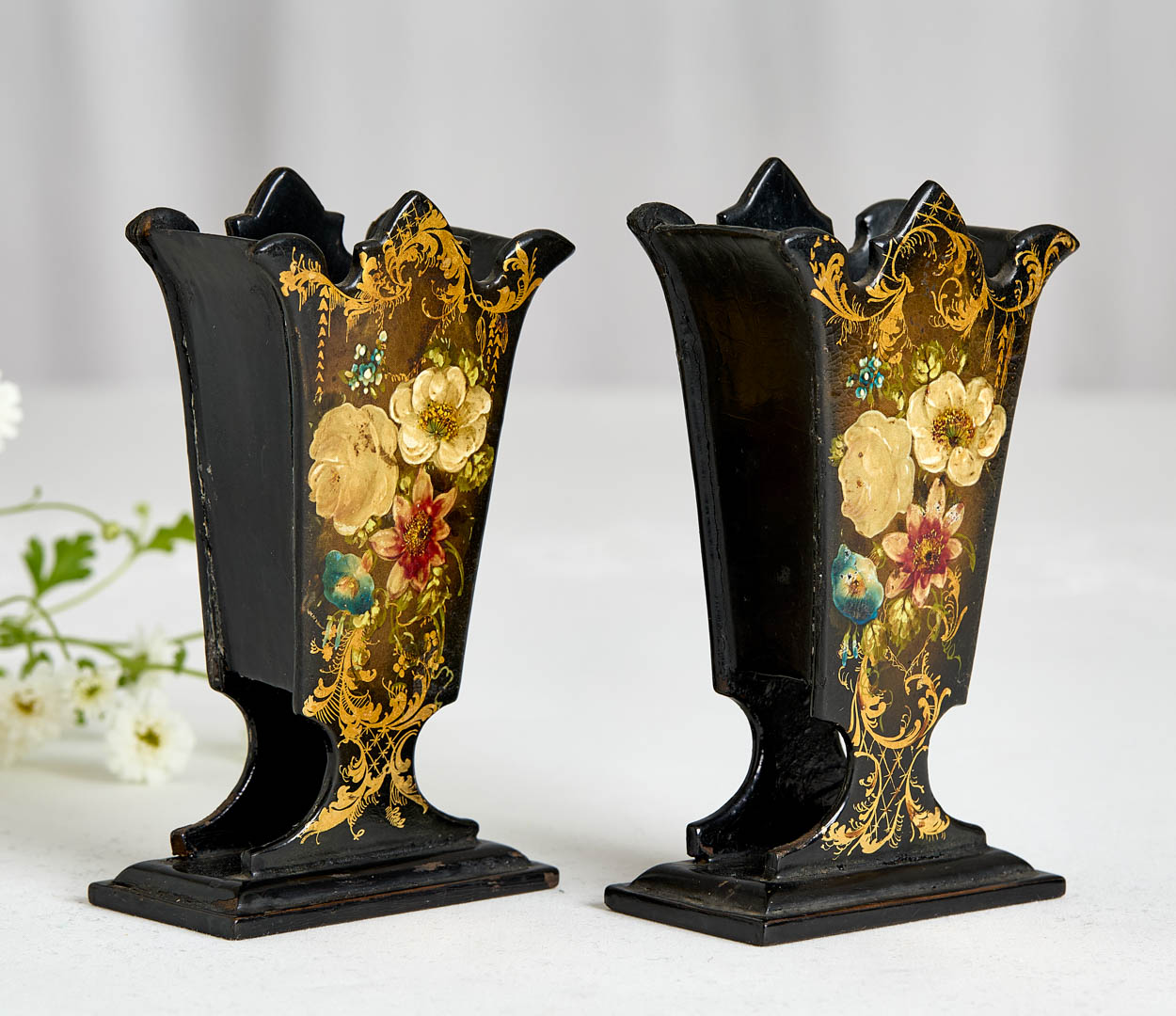 Acquired in France, a gorgeous 19th century pair of hand painted paper mache spill vases.